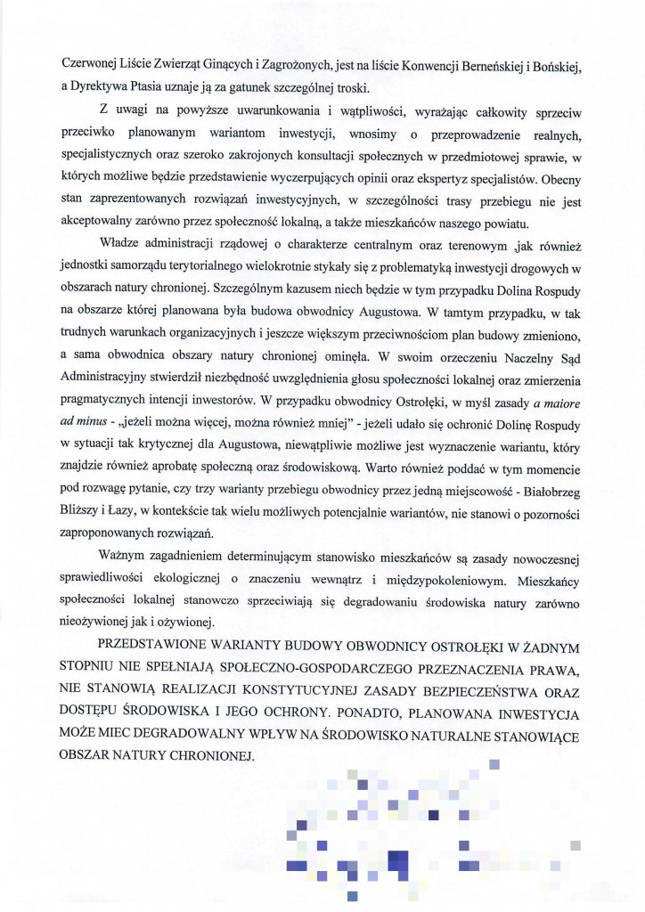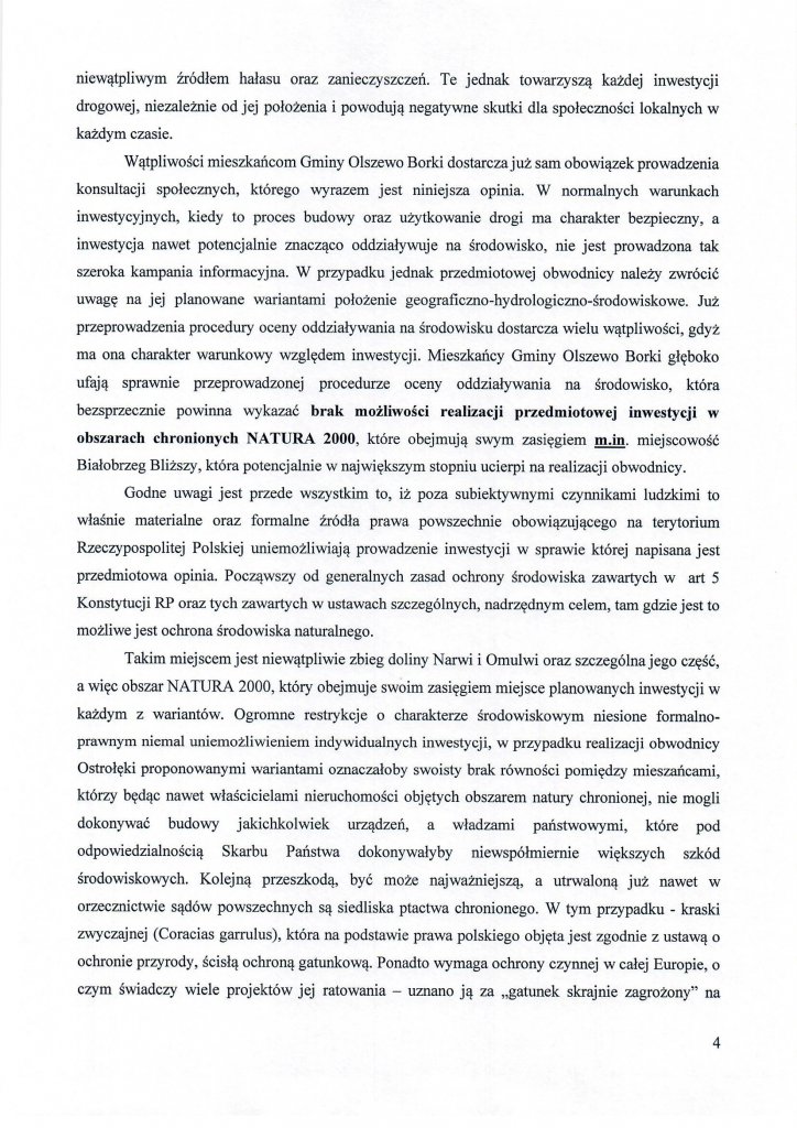 Mieszkańcy podostrołęckiej gminy stwierdzili, że przedstawione warianty budowy obwodnicy Ostrołęki w żadnym stopniu nie spelniają społeczno-gospodarczego przeznaczenia prawa, nie stanowią realizacji konstytucyjnej zasady bezpieczeństwa oraz dostępu środowiska i jego ochrony, a ponadto planowana inwestycja - według mieszkańców - może mieć degradowalny wpływ na środowisko naturalne stanowiące obszar natury chronionej.