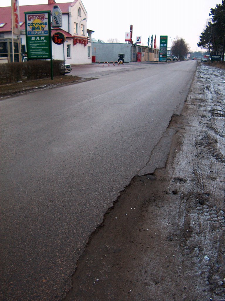 "Tuż przed stacją Benzol jest nieskończony kawałek drogi. Kończy się nowy asfalt, a zaczyna stary. Niestety komuś nie chciało się podczas tej wykonywanej niedawno inwestycji dokończyć ten odcinek drogi. Kierowcy - jak widać - wolą grząskie ziemne pobocze. Uwaga na zawieszenie. Kilka dziur, a raczej kilkumetrowy pas dołów i wyrw w miejscu gdzie powinna być jezdnia"