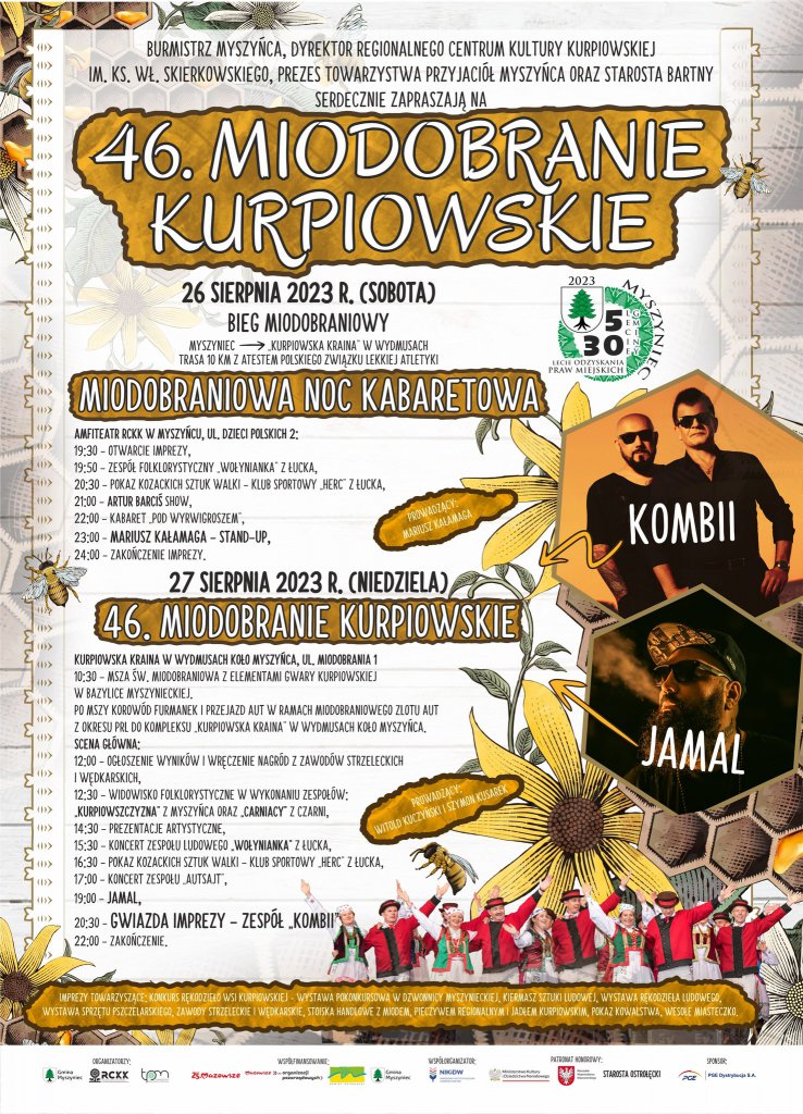 46. Miodobranie Kurpiowskie odbędzie się w dniach od 26 do 27 sierpnia. Dwudniowa impreza odbędzie się w amfiteatrze Regionalnego Centrum Kultury Kurpiowskiej, Kurpiowskiej Krainie w Wykrocie oraz w Bazylice Mniejszej w Myszyńcu.