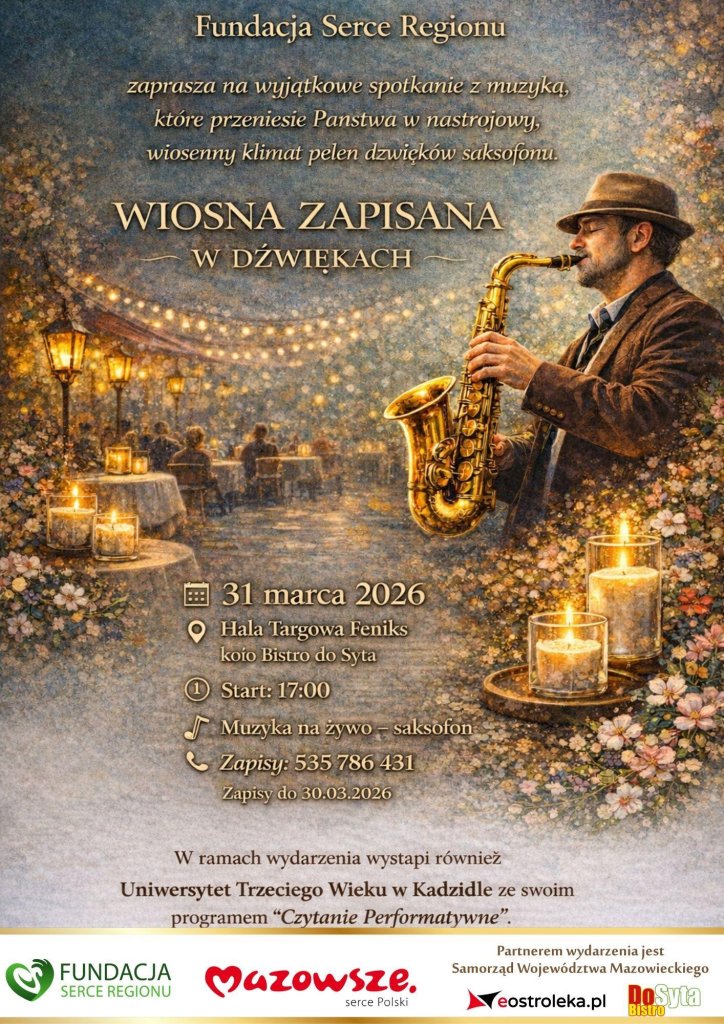 Głównym punktem wieczoru będzie nastrojowy koncert saksofonowy. Oprócz muzyki, na gości czeka też coś dla ducha - program „Czytanie Performatywne” w wykonaniu seniorów z Uniwersytetu Trzeciego Wieku w Kadzidle. Całość odbędzie się w oprawie pełnej ciepła i wiosennej magii.