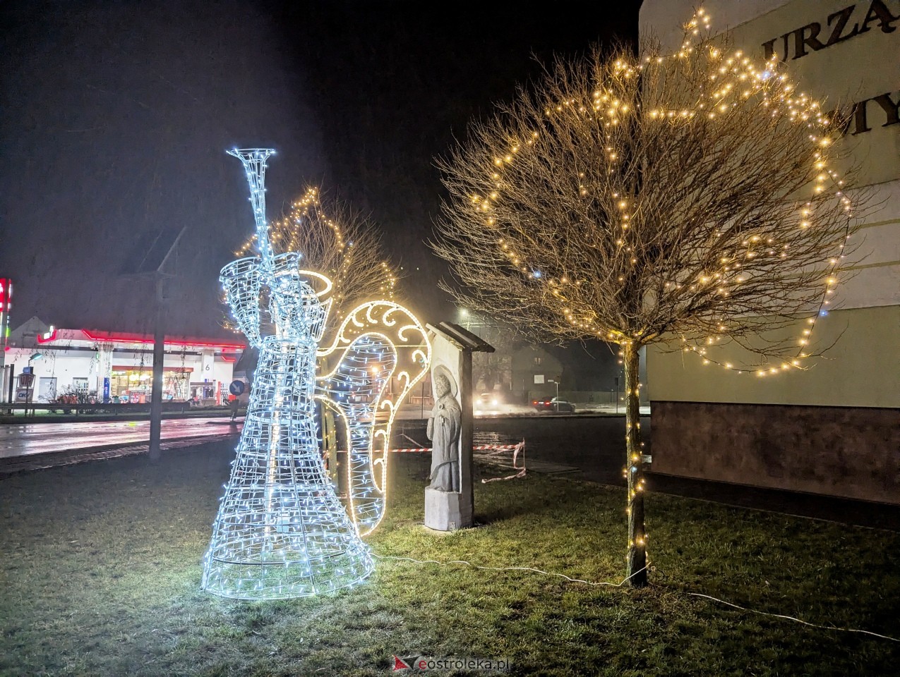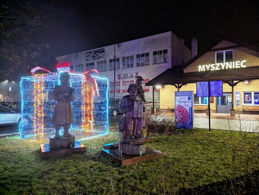 Największą atrakcją jest jednak instalacja przed budynkiem dworca. To... wielki prezent – świetlna konstrukcja widoczna z daleka, która stała się charakterystycznym punktem na mapie Myszyńca w okresie świątecznym.
