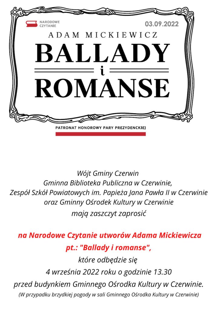 Akcja organizowana jest przez Prezydenta RP od 2012 r. Została zainicjowana wspólną lekturą „Pana Tadeusza” Adama Mickiewicza. Podczas tegorocznej, jedenastej ogólnopolskiej odsłony Narodowego Czytania uczestnicy wydarzenia będą wspólnie czytać „Ballady i romanse” Adama Mickiewicza. Do prezentacji wybrane zostały cztery ballady: Romantyczność, Lilie, Świtezianka, Pani Twardowska.