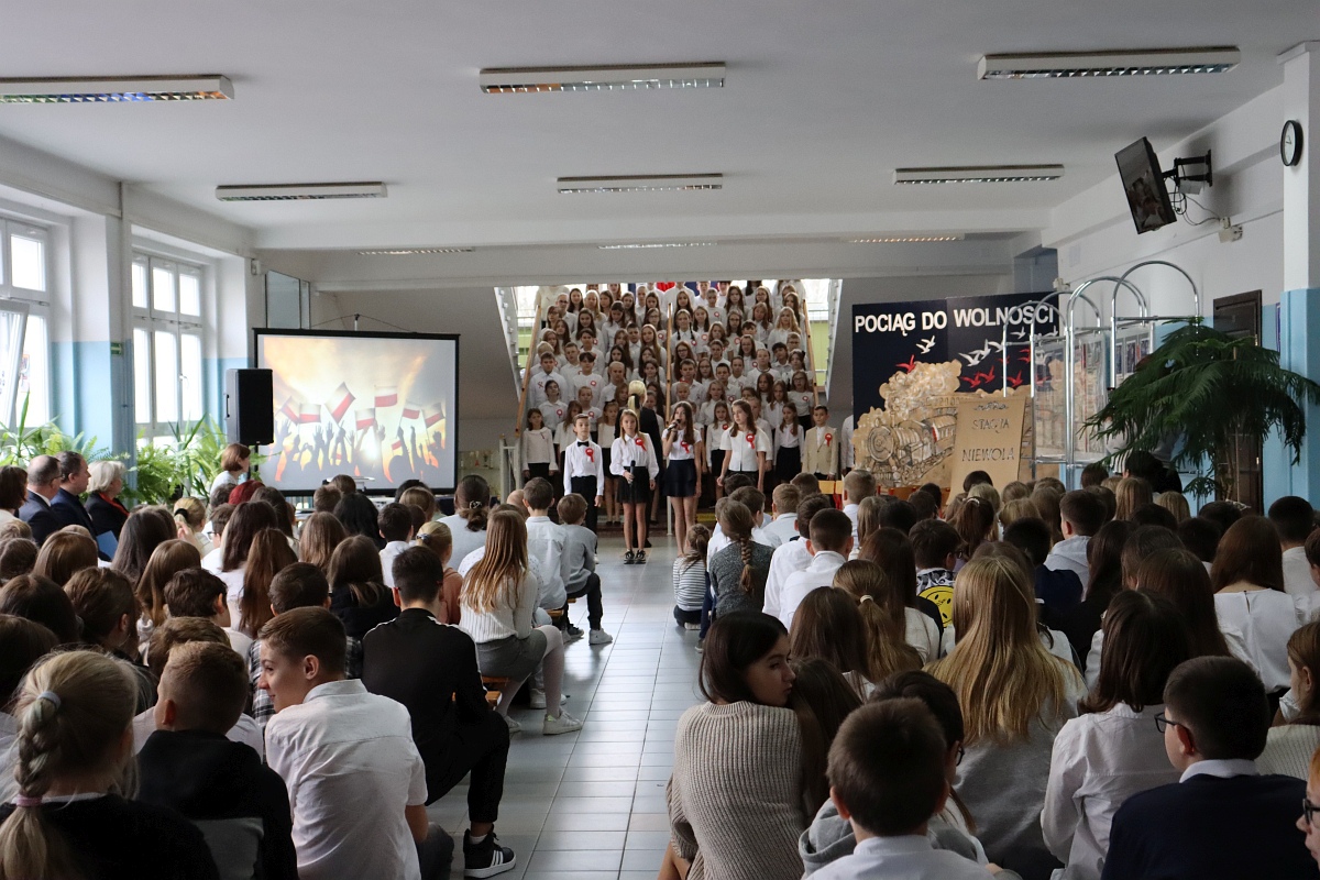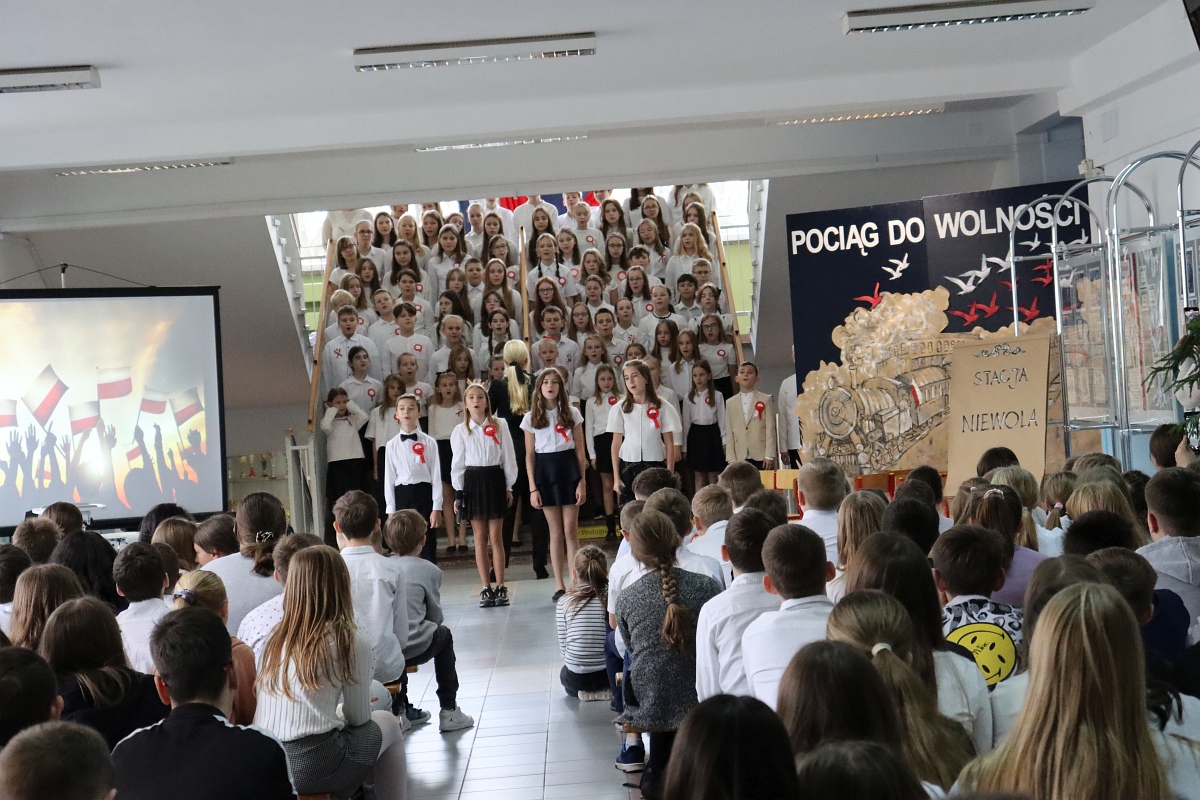 Apel odbył się 13 listopada pod hasłem"Pociąg do wolności". Uczniowie z klas: IVb, Vb, Vc, Vd, VIf oraz chór szkolny pięknie zaprezentowali część artystyczną. Słowem i pieśnią upamiętniono odzyskanie niepodległości przez Polskę, uczczono pamięć o bohaterach narodowych.