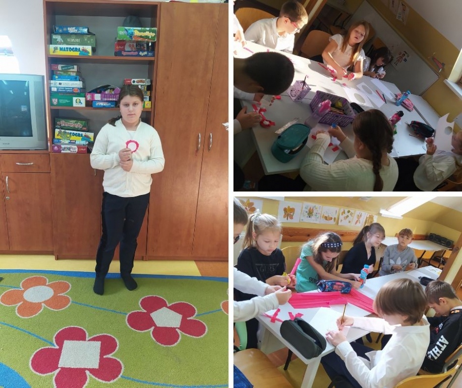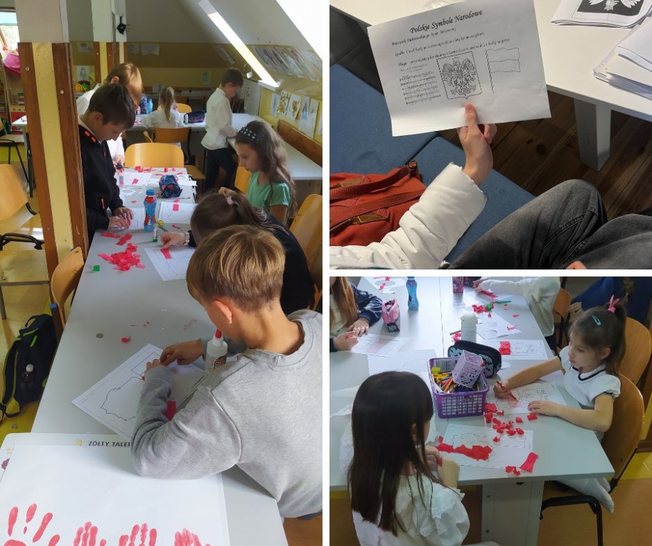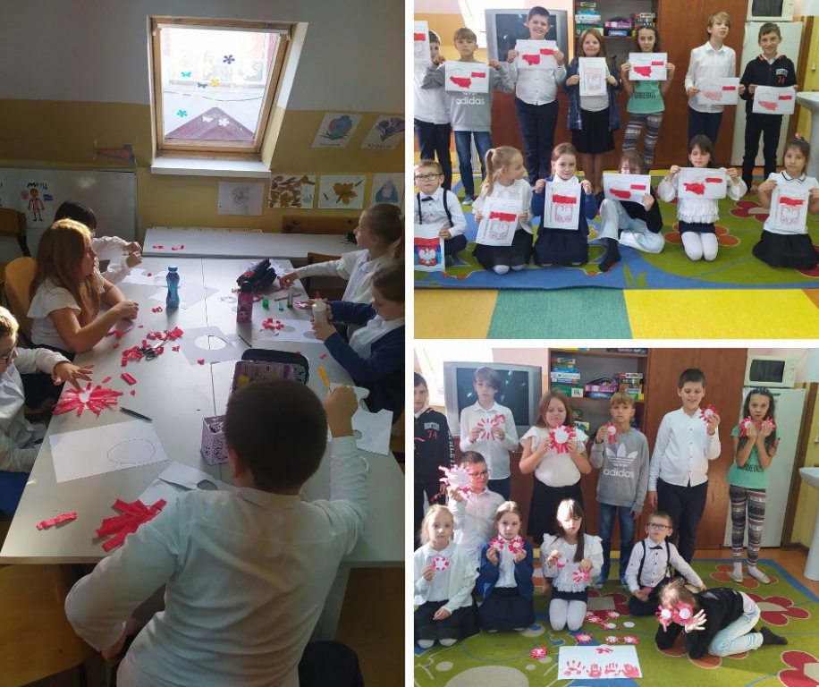 - wykonanie makiety polskiej wyklejanej biało-czerwonymi sercami, korony w barwach Polski, a nawet techniką origami wykonaliśmy białego orła na czerwonym tle,