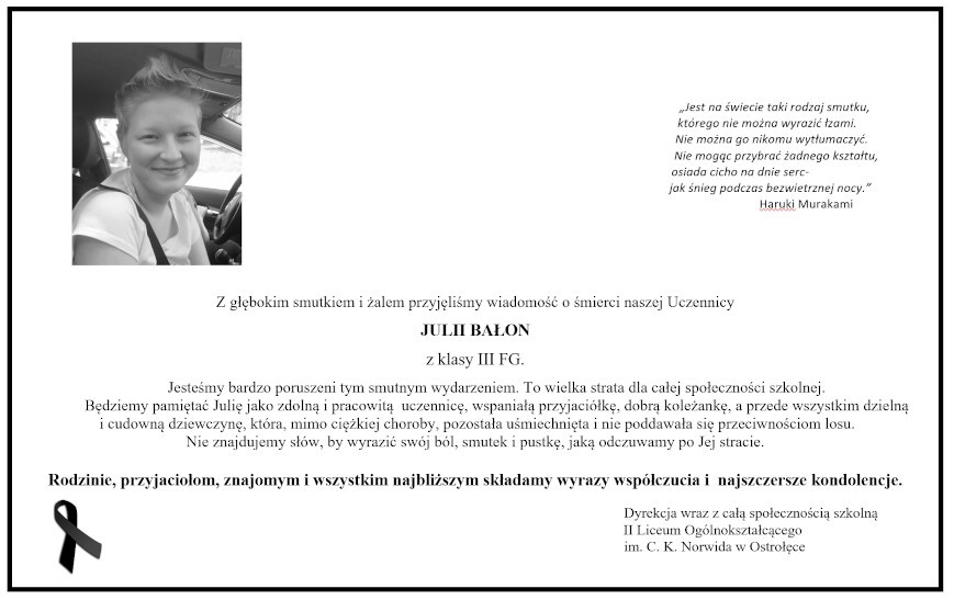 Po ciężkiej walce z nowotworem zmarła Julia Bałon, 18-letnia uczennica II Liceum Ogólnokształcącego w Ostrołęce. Szkoła pożegnała ją we wzruszających słowach. "Nie znajdujemy słów, by wyrazić swój ból, smutek i pustkę, jaką odczuwamy po jej stracie" - napisano w nekrologu na stronie szkoły.