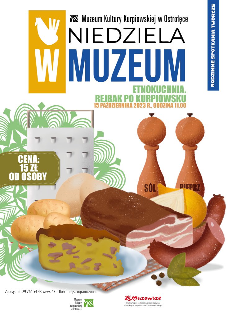 Muzeum Kultury Kurpiowskiej w Ostrołęce zaprasza na spotkanie z cyklu „Niedziela w Muzeum”, które odbędzie się 15 października 2023 roku o godzinie 11.00. Hasłem spotkania będzie „Etnokuchnia. Rejbak po kurpiowsku”. Podczas zajęć twórczyni kurpiowska nauczy gości wykonywania tradycyjnego rejbaka, czyli znanej i lubianej potrawy z ziemniaków z dodatkiem mięsa i cebuli. Uczestnicy, pod okiem mistrzyni, własnoręcznie przygotują składniki i upieką przepyszne danie według tradycyjnej receptury.