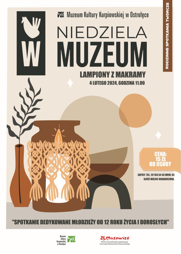 Muzeum Kultury Kurpiowskiej w Ostrołęce zaprasza na pierwsze w tym roku spotkanie z cyklu „Niedziela w Muzeum”. W muzealnej pracowni etnodizajnu powstaną nastrojowe lampioniki zdobione stylową, ręcznie plecioną przez uczestników makramą.