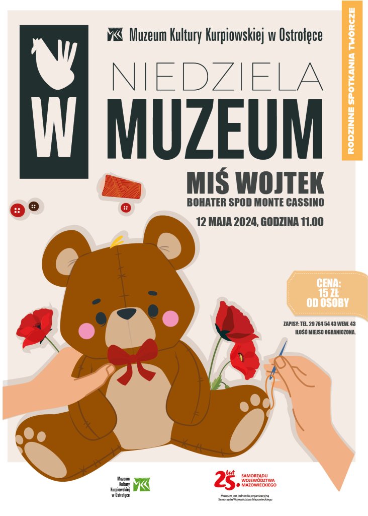 Muzeum Kultury Kurpiowskiej w Ostrołęce zaprasza na kolejne rodzinne spotkanie twórcze z cyklu „Niedziela w Muzeum”. W związku ze zbliżającą się 80. rocznicą bitwy pod Monte Cassino zajęcia nawiążą do niedźwiadka Wojtka, który towarzyszył żołnierzom 22. Kompanii Zaopatrywania Artylerii w 2. Korpusie Polskim pod dowództwem gen. Władysława Andersa.