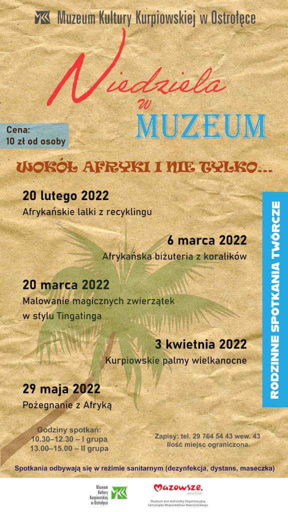 Muzeum Kultury Kurpiowskiej w Ostrołęce zaprasza na kolejną odsłonę rodzinnych spotkań twórczych pn. „Niedziela w Muzeum”. W związku z prezentowaną obecnie wystawą czasową „Zapatrzeni w niebo. Dogonowie i ich sztuka” zajęcia najczęściej będą nawiązywały do kultur afrykańskich, lecz nie tylko. Organizatorzy zapraszają rodziny z dziećmi do wspólnego spędzania niedziel w muzealnej pracowni etnodizajnu.