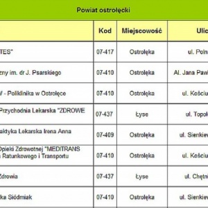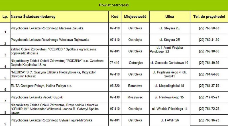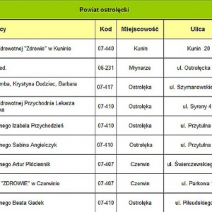 Poniżej aktualna lista placówek objętych kontraktami na podstawową opiekę zdrowotną na terenie Ostrołęki i powiatu ostrołęckiego.