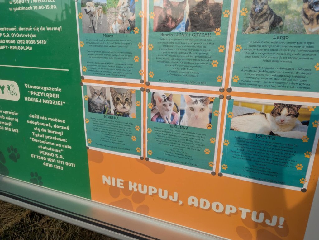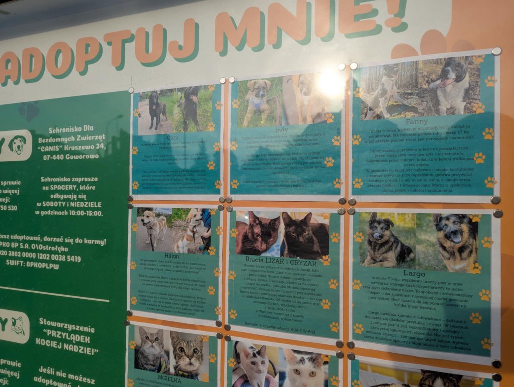 Na tablicy zamieszczone są ogłoszenia zwierząt do adopcji ze schroniska dla psów Canis, jak również z Przylądka Kociej Nadziei. Tablica stanęła w połowie czerwca i przyciąga uwagę - niekiedy można zaobserwować, jak ludzie zatrzymują się, by popatrzeć na umieszczone tam ogłoszenia.