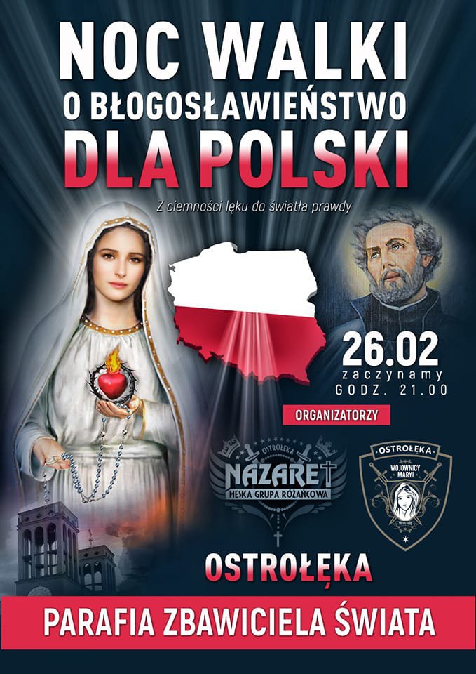 Wojownicy Maryi organizują akcję pod tytułem "Noc walki o błogosławieństwo dla Polski". Odbędzie się ona w nocy z soboty 26 lutego br. na niedzielę 27 lutego br. w różnych parafiach na terenie kraju. Również w Ostrołęce.
