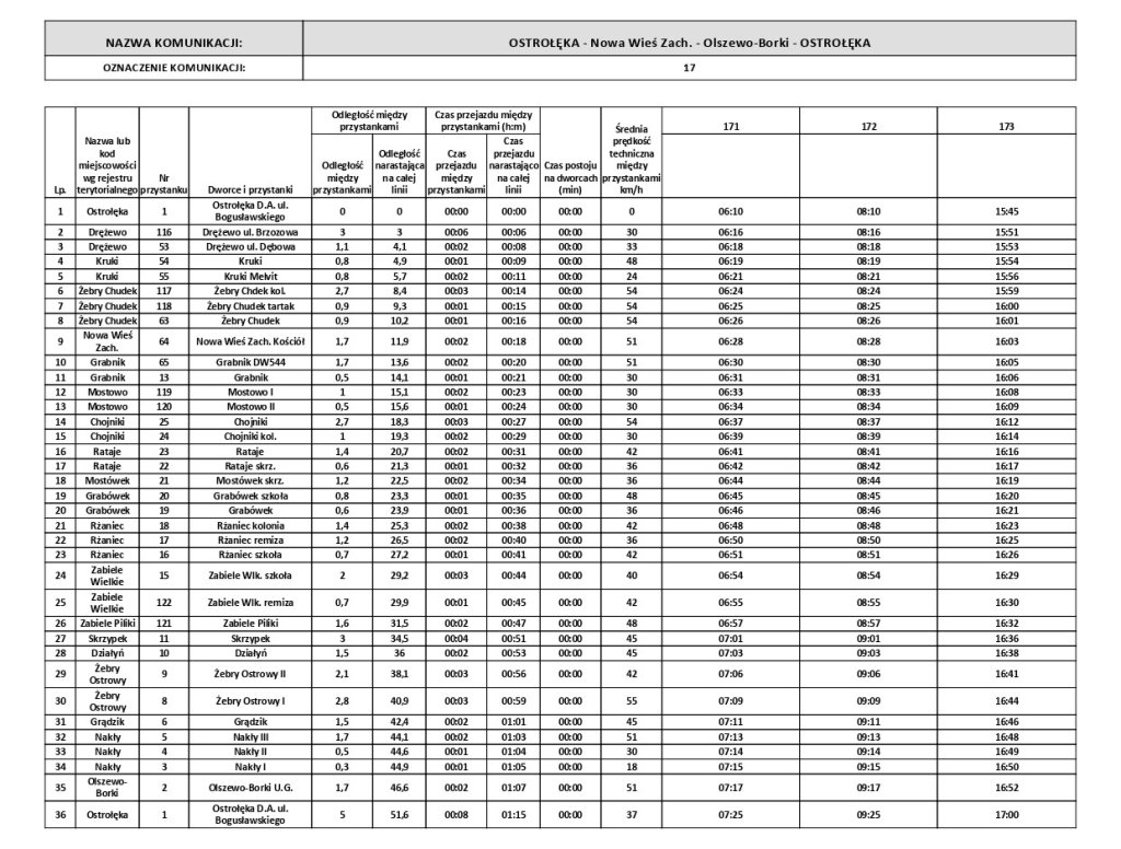 Autobusy zatrzymują się w takich miejscowościach jak: Dreżewo, Kruki, Żebry-Chudek, Nowa Wieś, Grabnik, Mostowo, Chojniki, Rataje, Mostówek, Grabówek, Rżaniec, Zabiele Wielkie, Zabiele Piliki, Skrzypek, Działyń, Żebry-Ostrowy, Grądzik, Nakły oraz Olszewo-Borki. To długo wyczekiwane udogodnienie komunikacyjne jest odpowiedzią na potrzeby mieszkańców, którzy od lat zabiegali o lepszy dostęp do transportu publicznego.