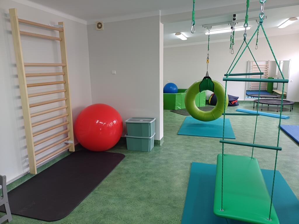 Nowoczesny gabinet został wyposażony w specjalistyczny sprzęt i pomoce terapeutyczne, które umożliwiają prowadzenie kompleksowych zajęć rehabilitacyjnych. Wśród zakupionych urządzeń znajdują się m.in. podwiesie sufitowe, drabinka gimnastyczna, trampolina, suchy basen z piłeczkami, platforma podwieszana, deskorolka oraz sprzęt rehabilitacyjny, sensoryczny i diagnostyczny. W poczekalni stworzono kącik zabaw dla dzieci, wyposażony w dywan, stolik oraz zabawki edukacyjne, co ma na celu zwiększenie komfortu oczekujących pacjentów.