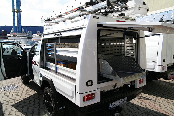 W części kabinowej auta posiadają dodatkowe miejsce na transport toreb monterskich lub innych akcesoriów. Część kontenerowa wyposażono w system regałów i szuflad, które pozwalają przechować niezbędne narzędzia, środki BHP i materiały do prac na sieci o łącznej wadze do 700 kg.