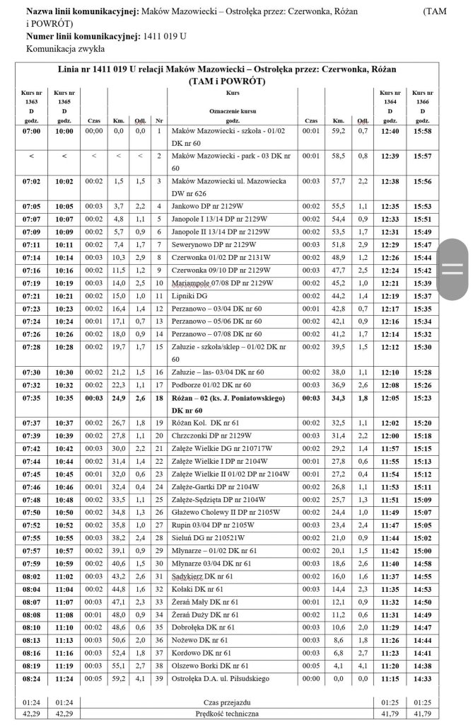 Autobus z Makowa Mazowieckiego wyjedzie do Ostrołęki o godz. 7:00. O godz. 8:07 będzie w Żeraniu Małym, o 8:08 w Żeraniu Dużym, o 8:10 w Dobrołęce, 8:13 - w Nożewie, 8:16 - w Kordowie, 8:19 w Olszewie-Borkach a do Ostrołęki dojedzie o 8:24. Drugi autobus z Makowa ruszy o 10:00. W naszym powiecie zatrzyma się: o godz. 11:07 w Żeraniu Małym, o 11:08 w Żeraniu Dużym, 11:10 w Dobrołęce, 11:13 w Nożewie, 11:16 w Kordowie, 11:19 w Olszewie-Borkach i 11:24 dojedzie do Ostrołęki.