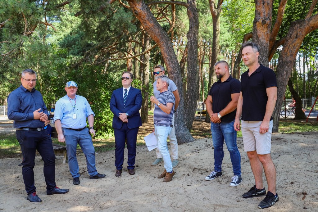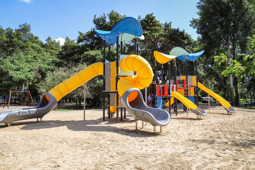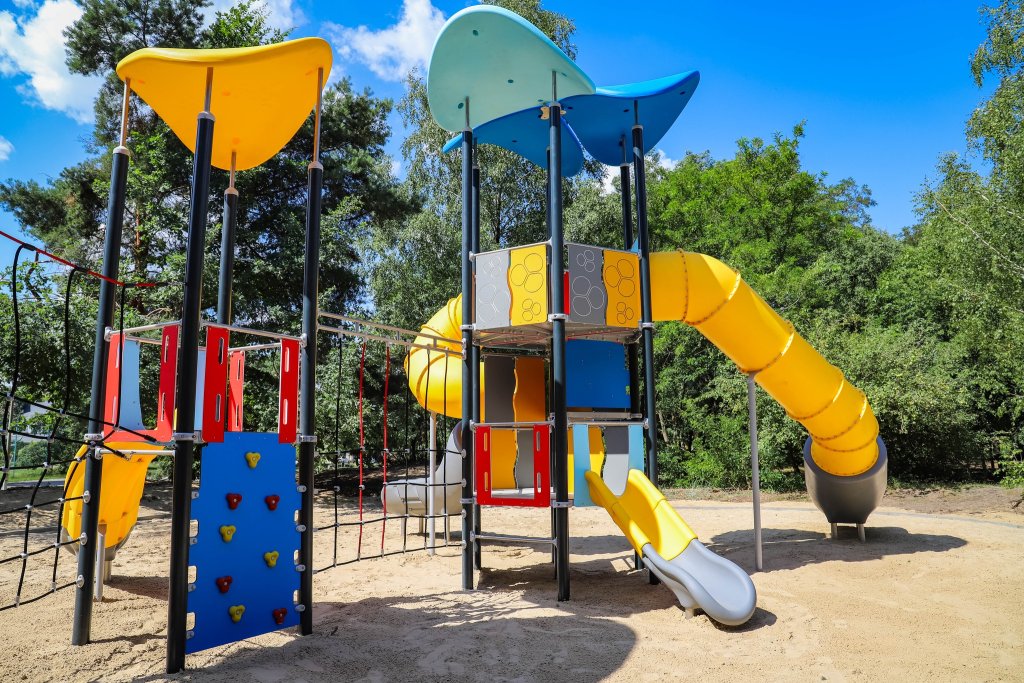 Zadanie inwestycyjne polegało na umieszczeniu w parku nowego urządzenia zabawowego złożonego z kilku połączonych ze sobą zjeżdżalni o wymiarach 806 x 1500 cm i wysokości maksymalnej 588 cm. Urządzenie zamontowano w miejscu dotychczasowego boiska do siatkówki. Do zadań wykonawcy należał także demontaż istniejących elementów boiska, wymiana nawierzchni na taką z piasku kwarcowego, dopasowaną do wysokości upadku z urządzenia wynoszącą 270 cm, wykonanie nowych obrzeży na ławie betonowej z oporem, zakup i montaż tablicy regulaminowej placu zabaw oraz pielęgnacja istniejącej zieleni po zakończeniu montaży.