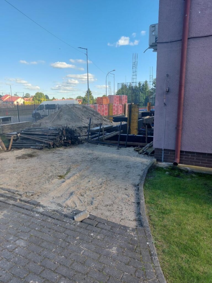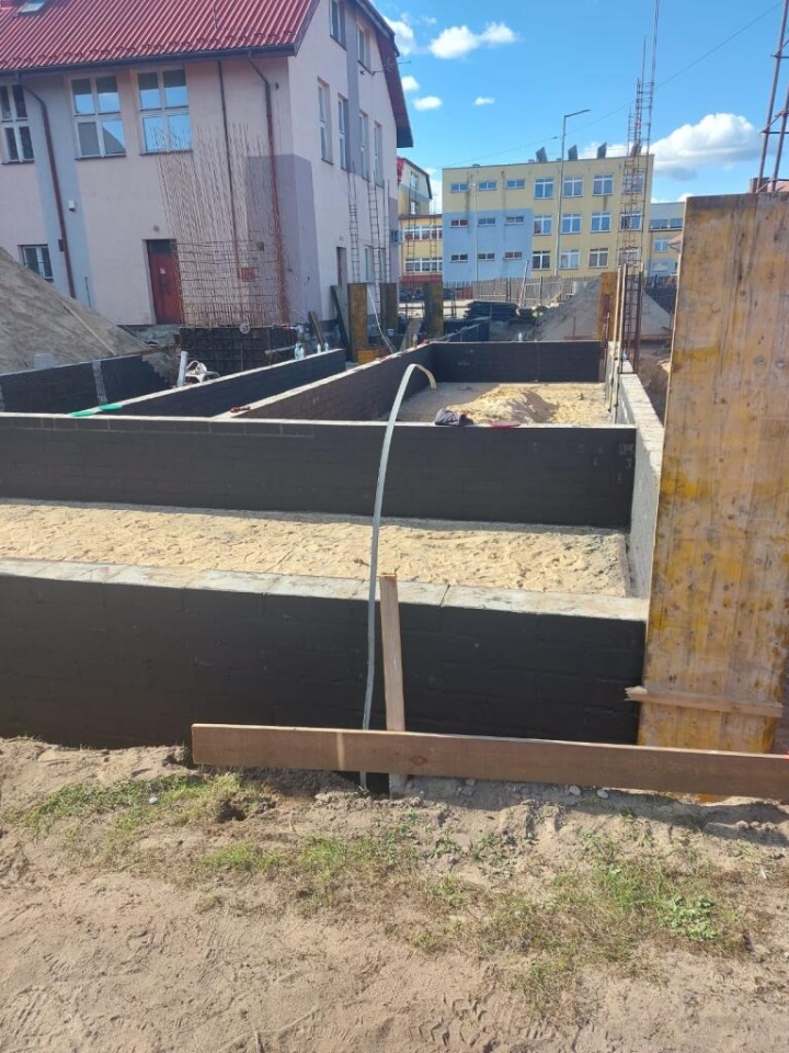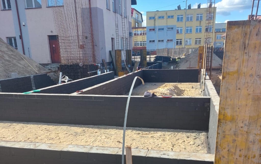 Do tej pory wykonano już szereg kluczowych prac ziemnych i fundamentowych, które stanowią solidną podstawę dla nowego obiektu. Z terenu budowy usunięto humus, a także rozebrano istniejącą kostkę brukową i elementy betonowe. Wykonano wykopy, a następnie przystąpiono do szalowania i zbrojenia ław, stóp oraz płyty fundamentowej pod szyb windowy. Fundamenty zostały już wylane, a obecnie przygotowywany jest materiał do wznoszenia ścian fundamentowych.