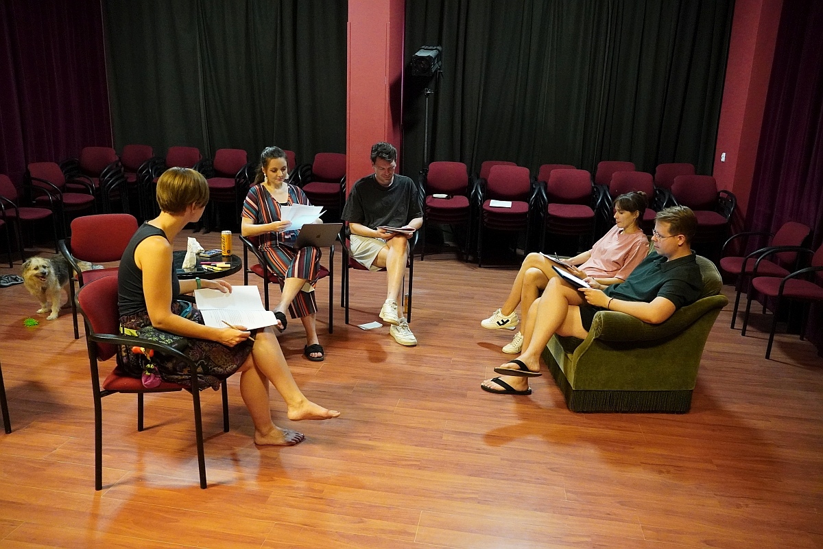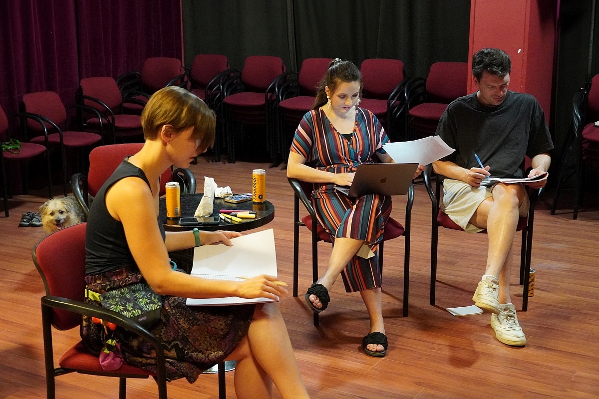 Spektakl ten zobaczymy w październiku. O tym, że warto czekać przekonaliśmy się podglądając aktorów podczas próby, na którą spotkali się dziś w Klubie Oczko. Wcześniej prowadzili próby, ale on-line. To dzisiejsze spotkanie to pierwsze wspólne granie na żywo, jeszcze bez charakteryzacji, strojów i… na krzesłach przed sceną. Pracują nad dialogami, testują emocje. Wszystko po to, by w październiku podczas wielkiej premiery wypaść jak najlepiej.