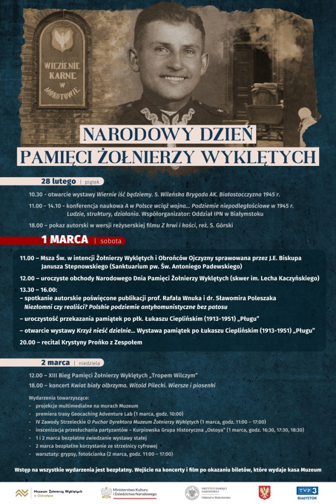 Uroczystości rozpoczną się w piątek, 28 lutego, od otwarcia niezwykłej wystawy pt. "Wiernie iść będziemy. 5. Wileńska Brygada AK. Białostocczyzna 1945 r.". Następnie odbędzie się konferencja naukowa "A w Polsce wciąż wojna... Podziemie niepodległościowe w 1945 r. Ludzie, struktury, działania", organizowana we współpracy z białostockim oddziałem Instytutu Pamięci Narodowej. Wieczorem zaplanowano pokaz autorskiej, reżyserskiej wersji filmu "Z krwi i kości" w reżyserii S. Górskiego, opowiadającego o losach płk. Łukasza Cieplińskiego "Pługa".