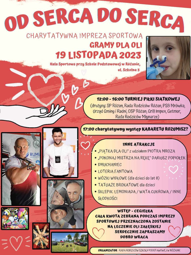 Rada Rodziców Szkoły Podstawowej w Różanie zaprasza na charytatywną imprezę sportową "Od serca do serca".