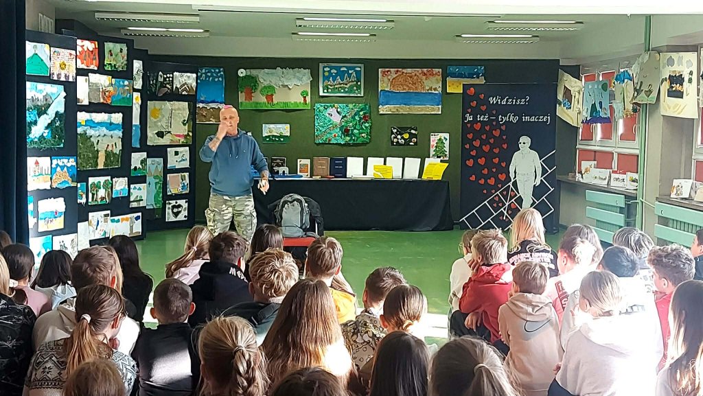 Sebastian opowiadał o swoim życiu, trudnościach i możliwościach, jakie dają mu nowoczesne technologie oraz przemyślane rozwiązania środowiskowe, dzięki którym może w pełni uczestniczyć w życiu społecznym. W dniach poprzedzających spotkanie wychowawcy prowadzili rozmowy i ćwiczenia, które przybliżały uczniom codzienność osób niewidomych i słabowidzących.