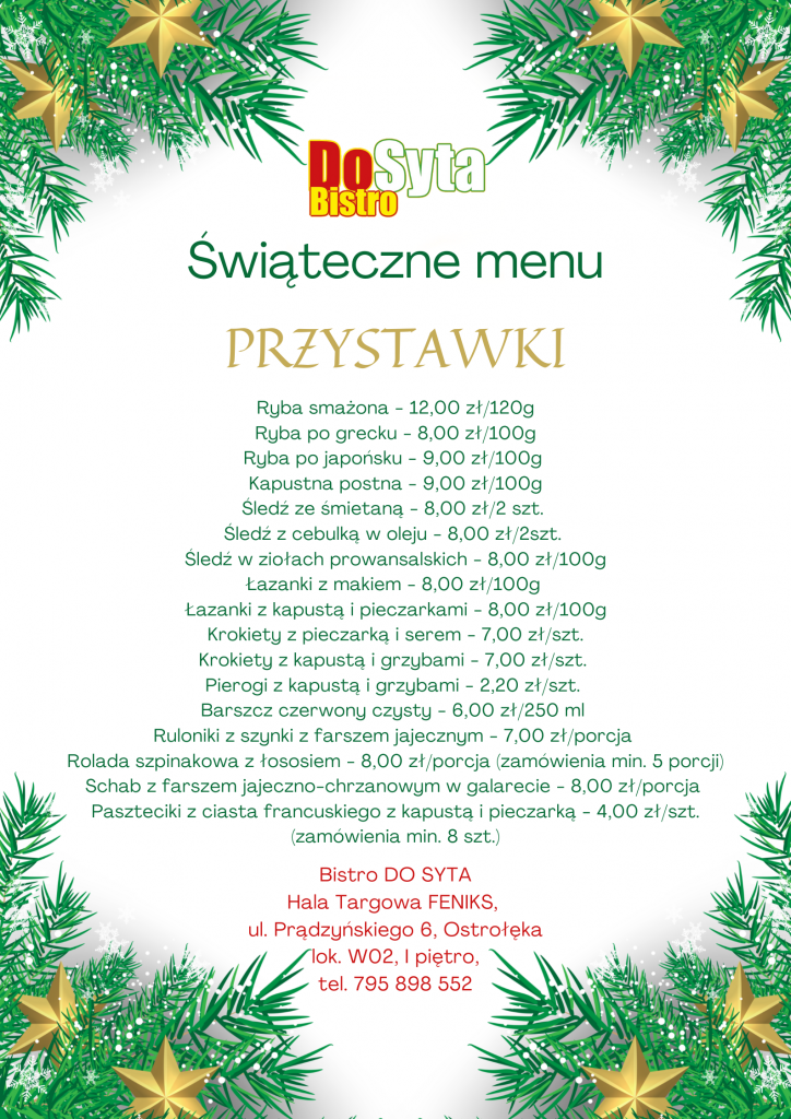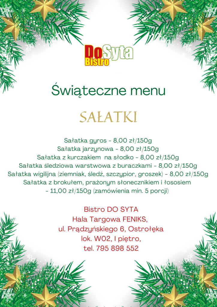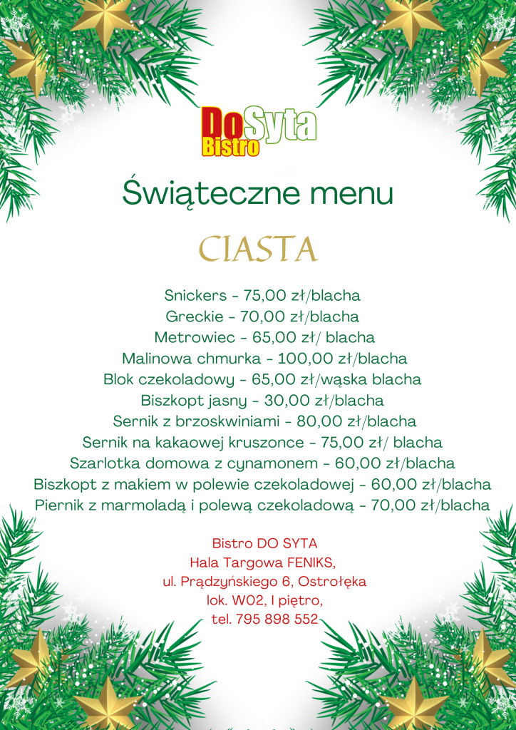 Zapraszamy do zapoznania się ze świąteczną ofertą cateringową Bistro do Syta w Ostrołęce. Te dania niezmiennie od lat wyróżniają się doskonałym smakiem i cieszą przy świątecznym stole. Duży wybór potraw, przystawek, a także ciast!