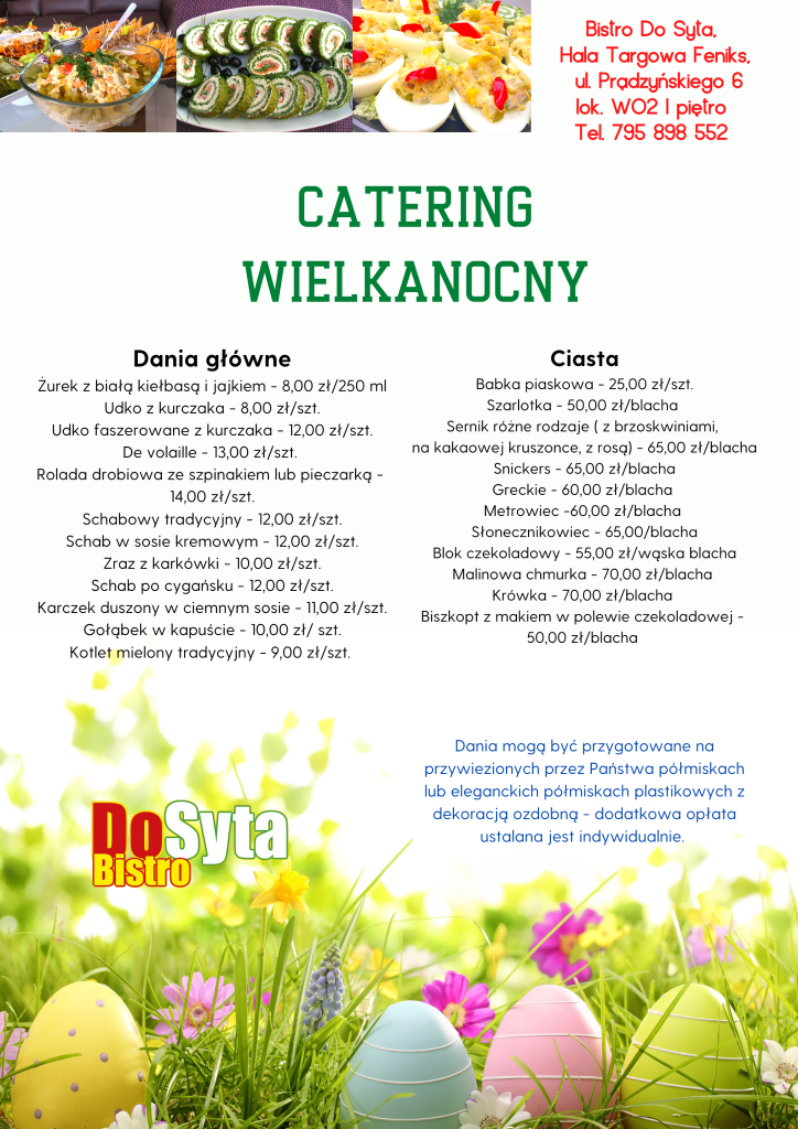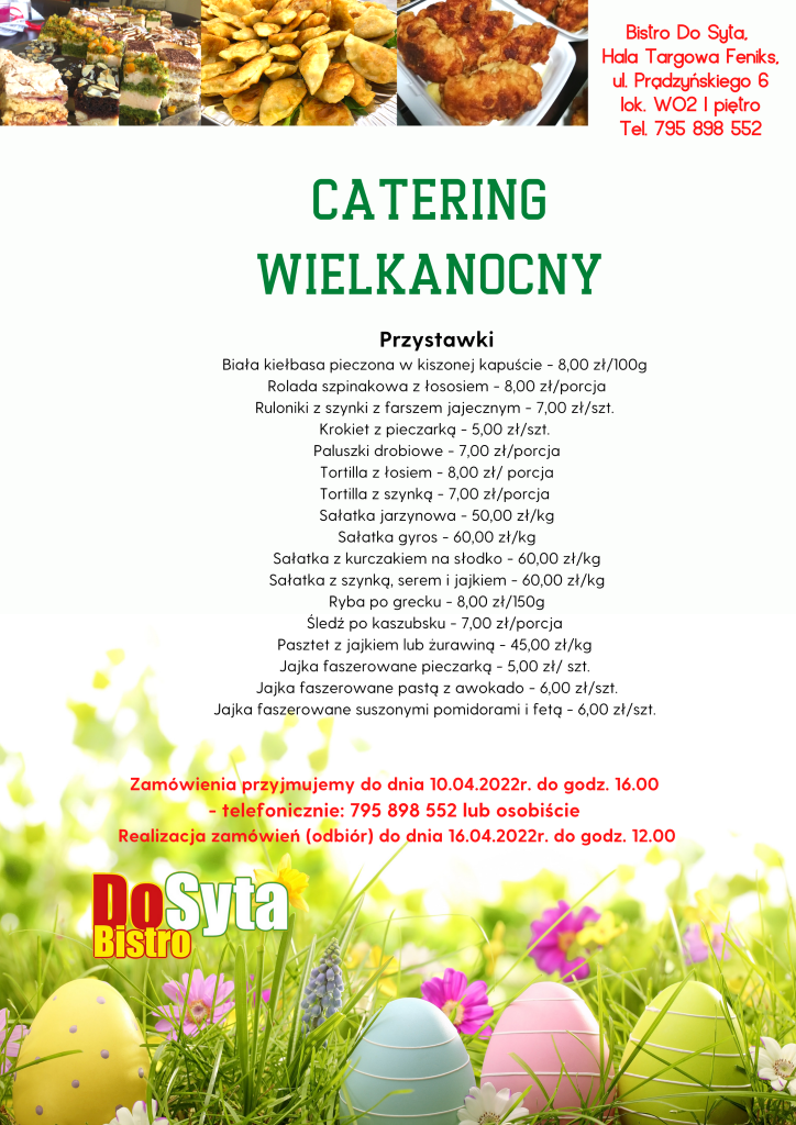Nie macie czasu na przygotowanie świątecznych potraw? Chcielibyście mieć na stole wielkanocnym pyszne potrawy bądź finezyjne kompozycje? Bistro „DoSyta” zajmie się tym! Zjecie bardzo smacznie, oszczędzając czas na przygotowania.