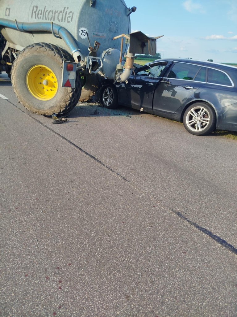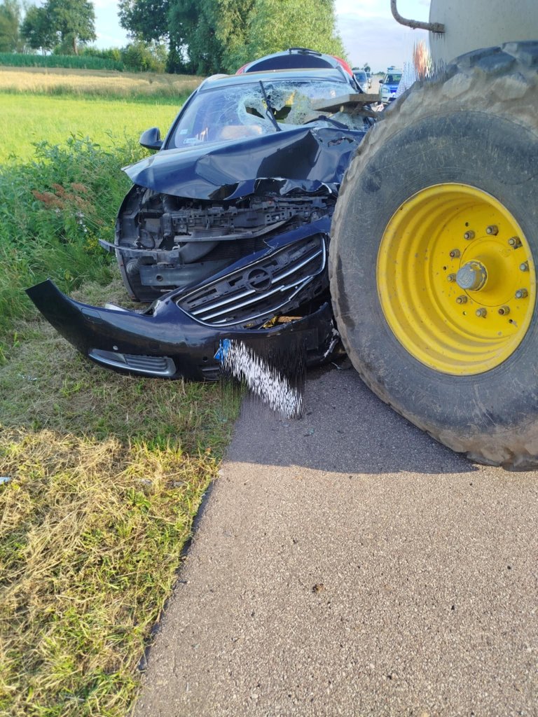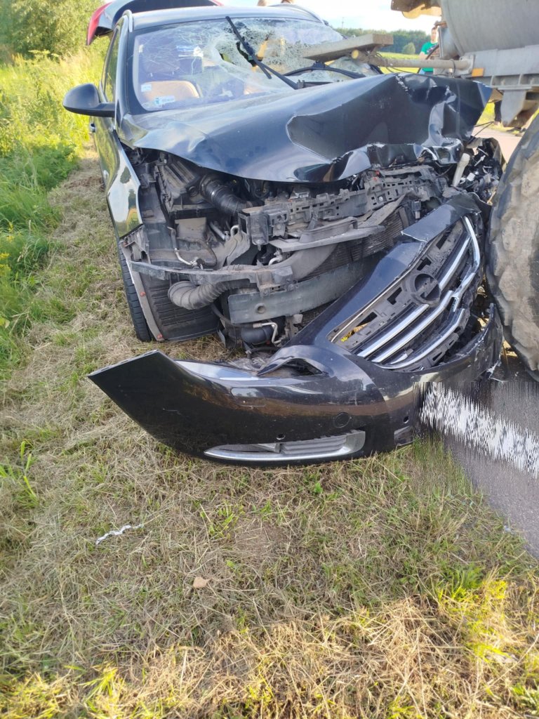 Do zdarzenia doszło na jednej z lokalnych dróg w gminie Goworowo. Kierowca opla insigni najwyraźniej nie zauważył ciągnika z beczkowozem i uderzył w jego tył.