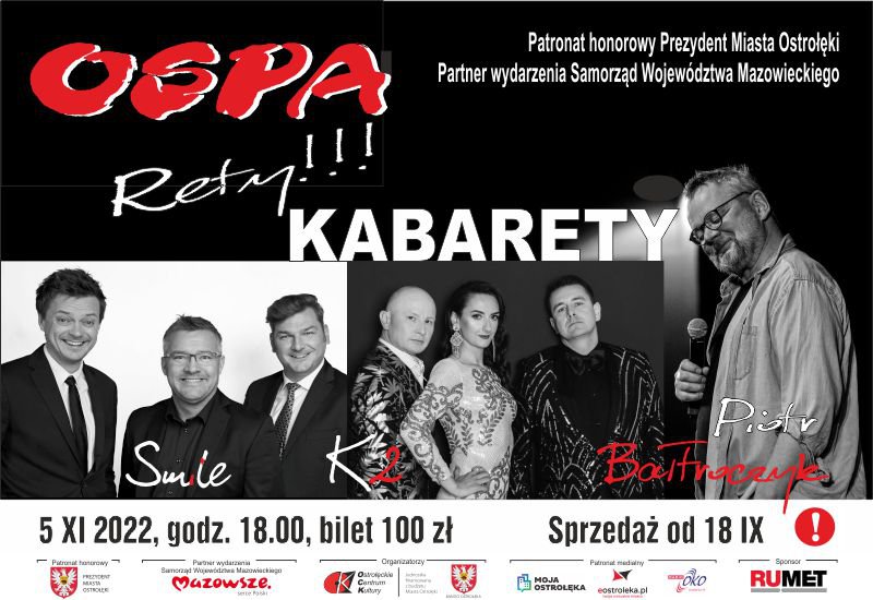 Ruszyła sprzedaż biletów na OSPĘ 2022 – wieczór kabaretowy pod patronatem Prezydenta Miasta Ostrołęki, który odbędzie się 5 listopada o godzinie 18.00. Partnerem wydarzenia jest Samorząd Województwa Mazowieckiego.