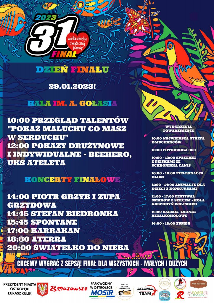 Tego dnia w programie ostrołęckiego finału zaplanowano wiele ciekawych eventów. Będzie m.im. przegląd artystyczny “Pokaż maluchu co masz w serduchu”, pokazy sportowców, strefa “dmuchańców”, konkursy z nagrodami dla dzieci, spacery z psami ze schroniska Canis, strefa pielęgnacji dłoni, festiwal smaków z sercem z udziałem kół gospodyń wiejskich, barmix - strefa drinków bezalkoholowych, pokaz zumby.