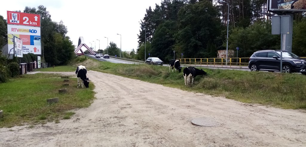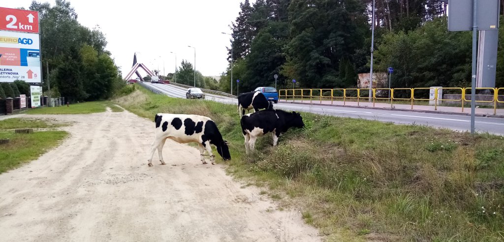 Krowy skubiące spokojnie trawę przy ruchliwej drodze na terenie Ostrołęki to dziś dość rzadki widok. W poszukiwaniu posiłku trzy krowy zawędrowały w okolice restauracji McDonalds przy moście Madalińskiego. Zwierzęta zwróciły na siebie uwagę przechodniów i kierowców, aż ktoś zorientował się, że musiały uciec z jednego z okolicznych, niewielkich gospodarstw i zawiadomił policję.