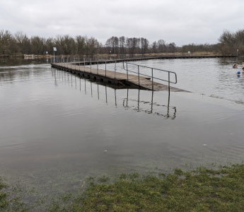 Woda wdziera się na plażę miejską odcinając dostęp do pomostu.