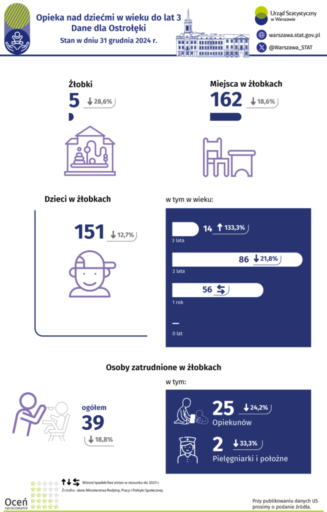 Z danych Urzędu Statystycznego w Warszawie wynika, że w Ostrołęce, według stanu w dniu 31 grudnia 2024 r., działało 5 żłobków, liczba oferowanych przez nie miejsc wyniosła łącznie 162. W stosunku do 2023 r. zanotowano spadek liczby żłobków o 28,6%, a miejsc o 18,6%. Liczba dzieci w żłobkach wyniosła 151 i była niższa niż w 2023 r. o 12,7%. Według wieku, najliczniejszą grupę w żłobkach stanowiły dwulatki, było ich 86, następnie dzieci w wieku 1 rok – 56, a w wieku 3 lat – 14. Dzieci w wieku poniżej roku nie było w żłobkach.