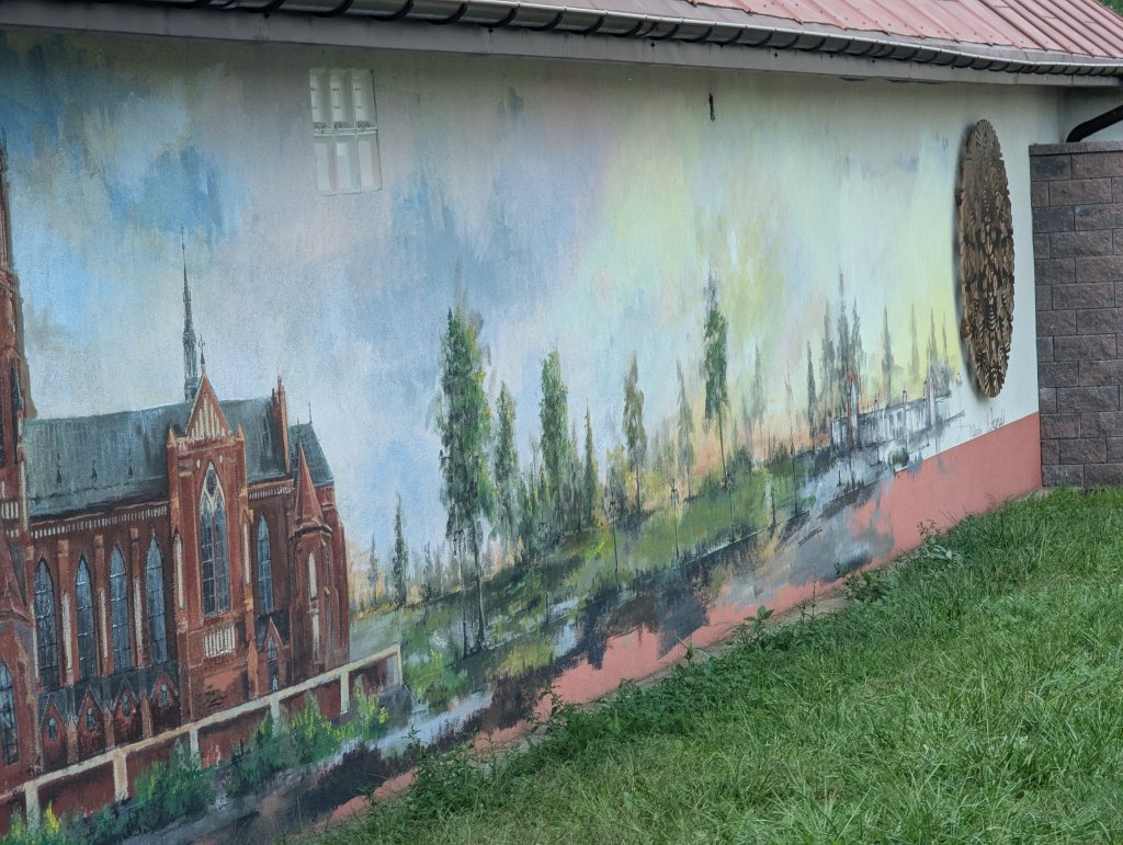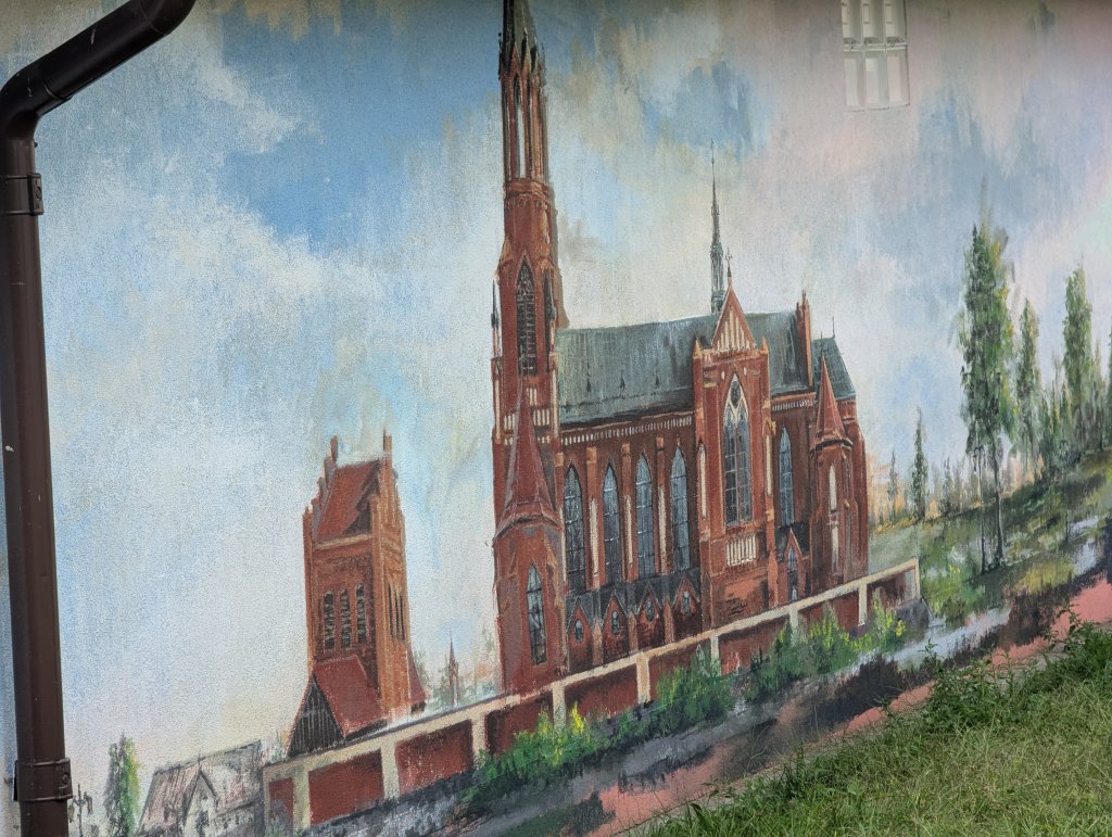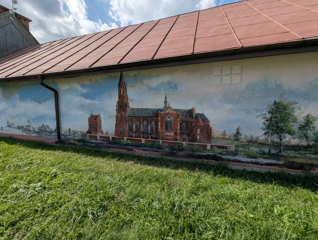 Mural na budynku przy parafii to prawdziwa podróż w czasie. Łomżyński architekt Franciszek Przecławski pokazuje swoje dzieło - świątynię, jaką zaprojektował i która dziś jest prawdziwą wizytówką Kurpiowszczyzny. Na muralu nie mogło zabraknąć imponującego gmachu kościoła.
