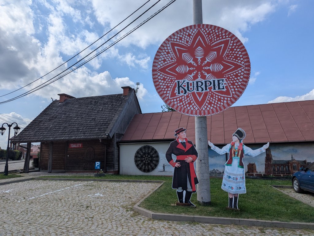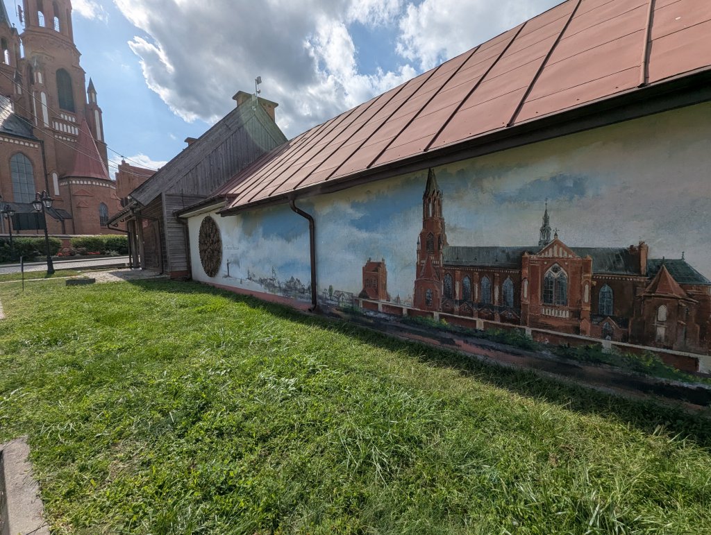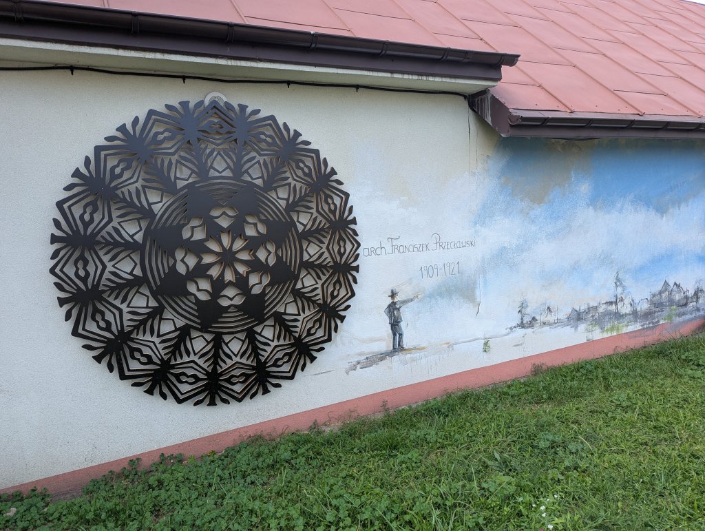 Generalnie, warto zauważyć niezwykle zadbane otoczenie myszynieckiej bazyliki. Za kościołem znajdziemy m.in. tablice pokazujące najważniejsze wydarzenia z życia parafii, odniesienia do kultury kurpiowskiej, czy ten właśnie mural. Oto Kurpie właśnie!
