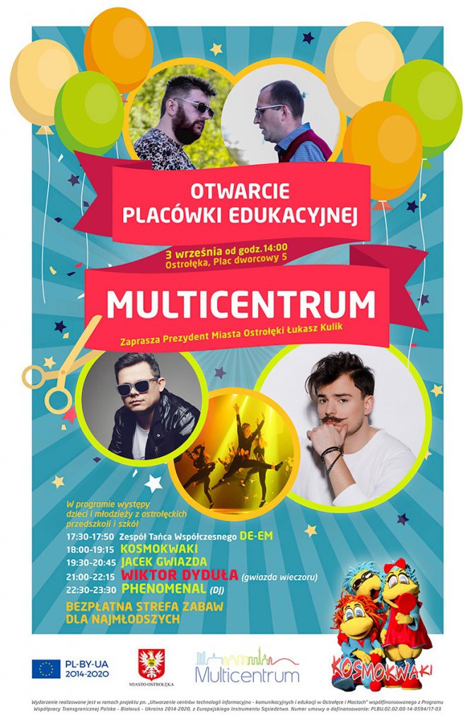 Otwarcie Multicentrum odbędzie się 3 września, od godz. 14.00. W programie m.in. występy dzieci i młodzieży z ostrołęckich szkół i przedszkoli, a także seniorów. O 17:30 wystąpi zespół tańca współczesnego DE-EM. O godz. 18:00 występ Kosmokwaków. O 19:30 wystąpi Jacek Gwiazda, a o 21:00 - gwiazda wieczoru, czyli Wiktor Dyduła. Zabawę zakończy Phenomenal o 22:30.