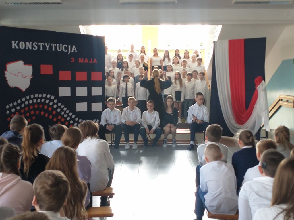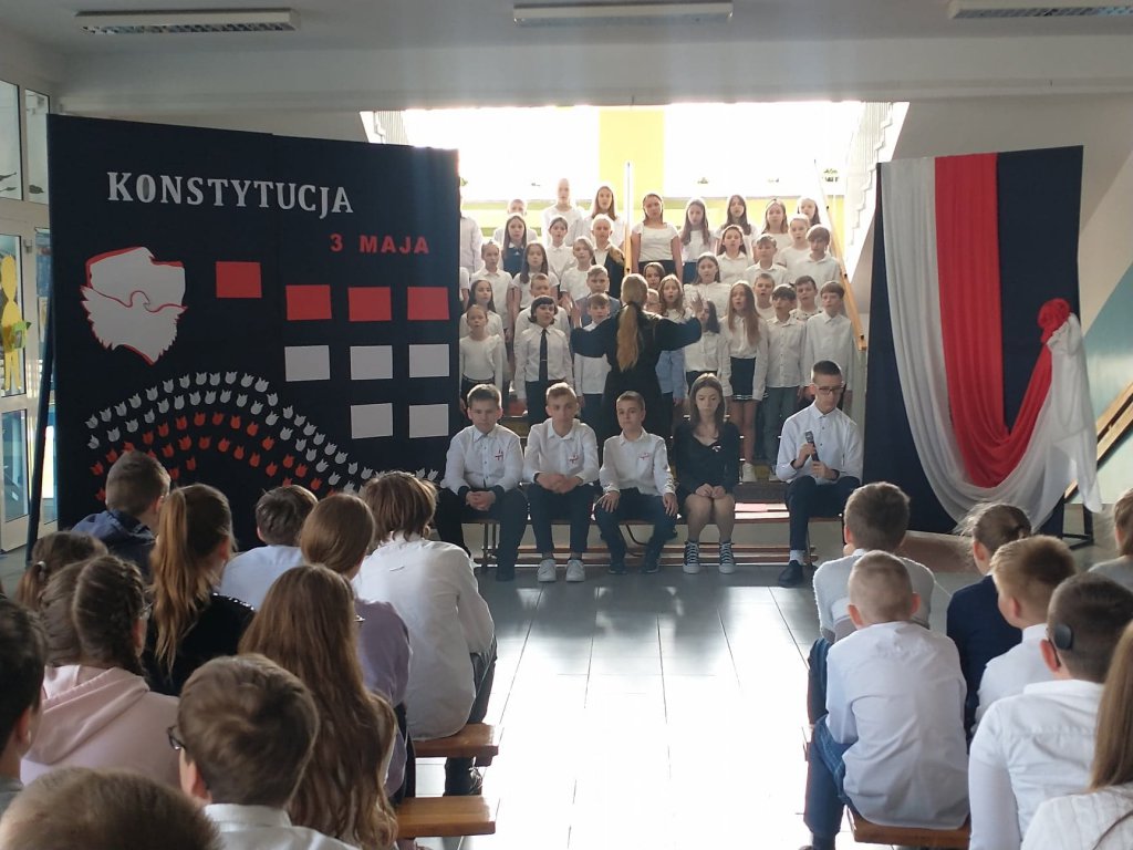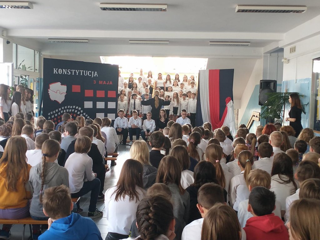 Uczniowie klas VI b, VII d, VII e i VIII g przypomnieli uczniom trudną sytuację naszego kraju – rozbiory Polski. Zaprezentowali również najważniejsze wydarzenia związane z uchwaleniem Konstytucji 3 maja. Na apelu nie zabrakło także inicjatora tej ustawy – króla Stanisława Augusta Poniatowskiego. Chór pod kierunkiem p. Wioletty Dziedzickiej zaśpiewał piękne pieśni patriotyczne, m.in. „Marsz Polonia”, „Polska flaga”, „Modlitwa o pokój”.