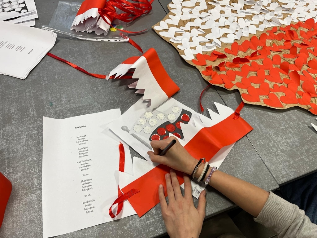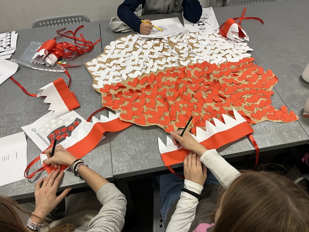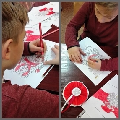 W ramach zajęć plastycznych dzieci, słuchając pieśni patriotycznych i melodii żołnierskich, wspólnie wykonywały biało – czerwone kotyliony, kolorowały w barwy narodowe rysunki patriotyczne oraz rozwiązywały krzyżówki.