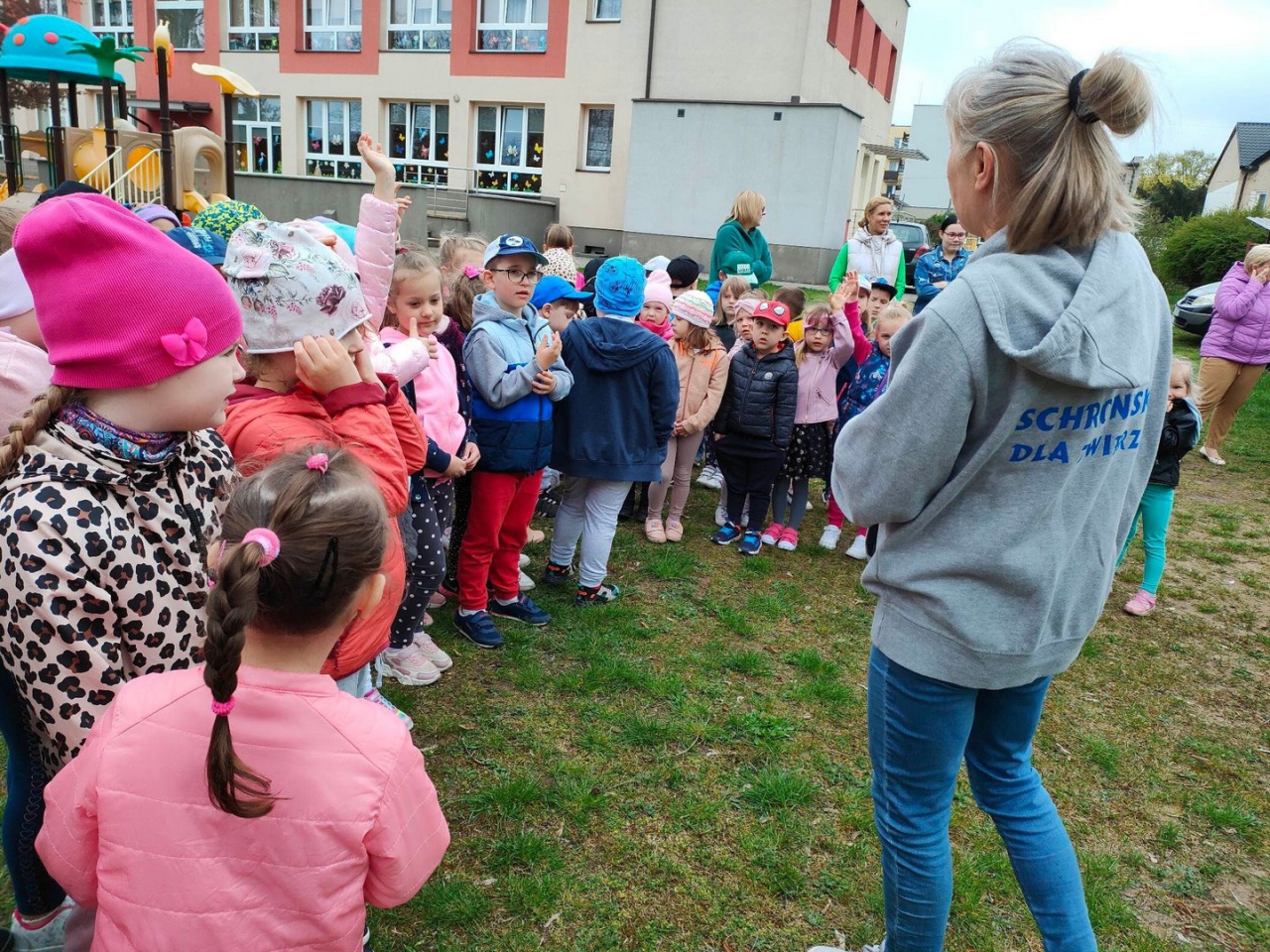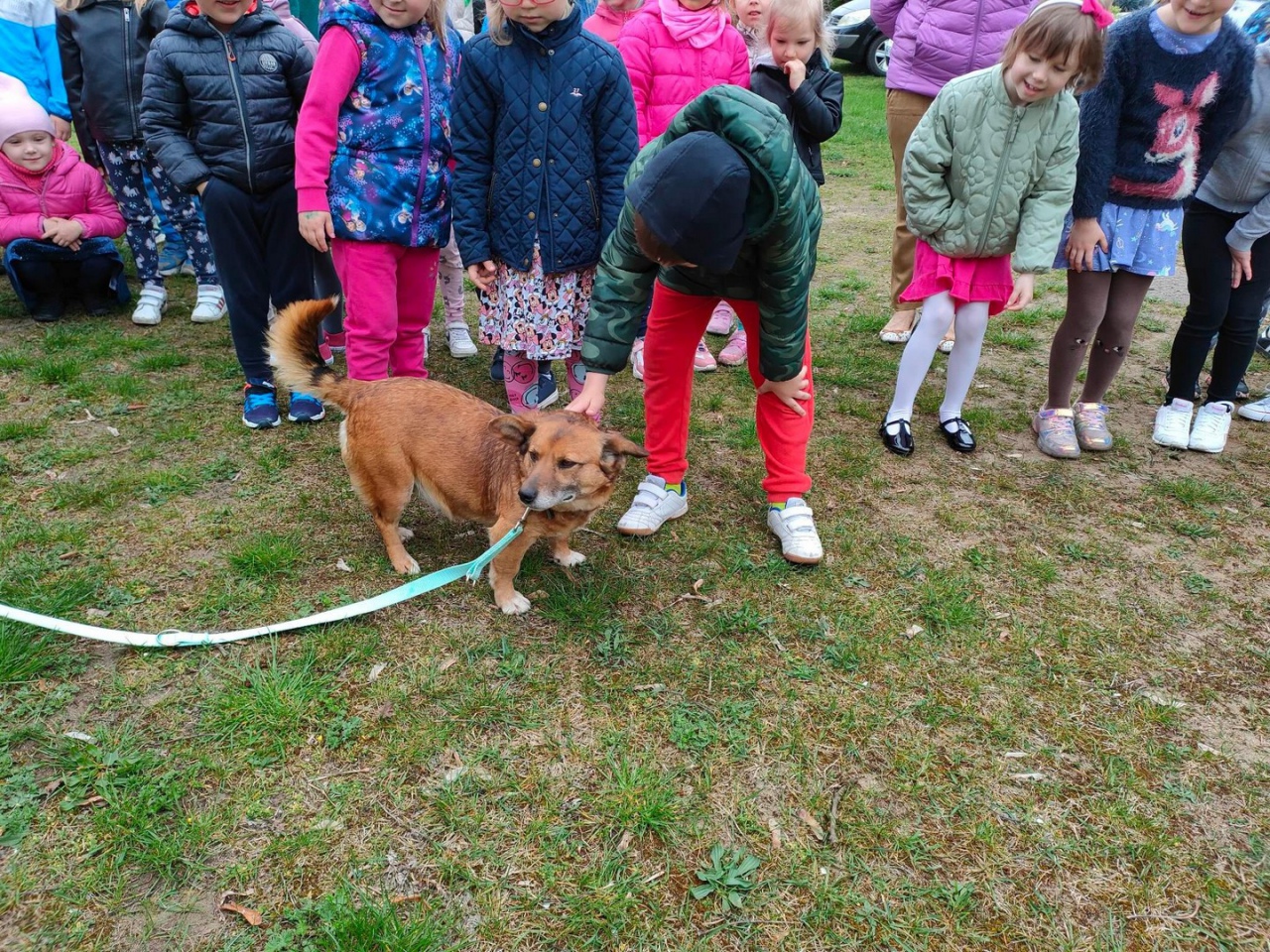 Cieszymy się, że tak wielu przedszkolaków odpowiedziało na nasz apel i wzięło udział w akcji . Los bezdomnych, porzuconych zwierząt nie jest obojętny dzieciom naszego przedszkola. Uroczysty odbiór darów odbył się 25 kwietnia. Tego dnia przedszkole odwiedziła właścicielka schroniska ze swoim podopiecznym. Pani Wiesława Rykowska opowiedziała dzieciom o zwierzętach przebywających w schronisku oraz zasadach adopcji. Przedszkolaki chętnie zadawały pytania oraz bawiły się z czworonożnym gościem. Dzieci na koniec spotkania zaśpiewały piosenkę „Pieski małe dwa".