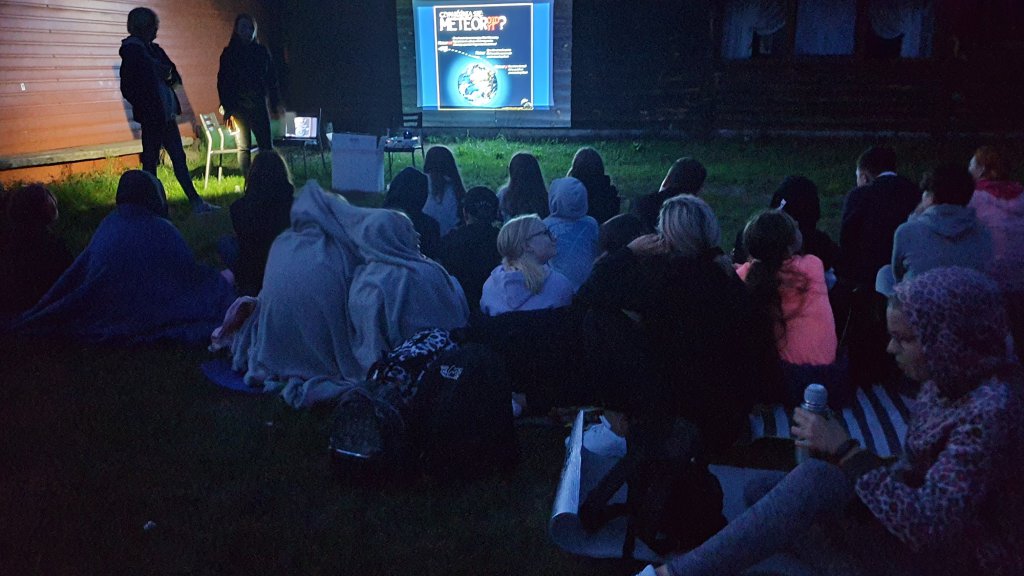Poznaliśmy niezwykłą historię największego w historii deszczu meteorytów, jaki miał miejsce w 1868 roku w Pułtusku. Meteoryty, które tam spadły można obejrzeć w Londynie, Warszawie oraz Muzeum Regionalnym w Pułtusku. Cofnęliśmy się w czasie nawet jeszcze dalej, aż do starożytnej Grecji i usłyszeliśmy opowieść o dzielnym Perseuszu, który uwolnił Andromedę przykutą do skały przez boga mórz Posejdona. Na nieboskłonie zobaczyliśmy gwiazdozbiór Perseusza, który znajduje się w kierunku północno-wschodnim , a obok znajdują się gwiazdozbiory Andromedy oraz jej rodziców Kasjopei i Cefeusza. Słuchając opowieści o Perseuszu i Andromedzie rozpoczęliśmy obserwacje nieba… pogoda nam sprzyjała – mieliśmy czyste, ciemne niebo pełne gwiazd, a każda „spadająca gwiazda” wywoływała zachwyt i entuzjazm!