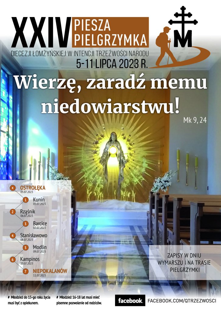 Diecezjalne Duszpasterstwo Trzeźwości zaprasza na Pieszą Pielgrzymkę z Ostrołęki do Niepokalanowa. Tegoroczna pielgrzymka wyruszy pod hasłem "Wierzę, zaradź memu niedowiarstwu".