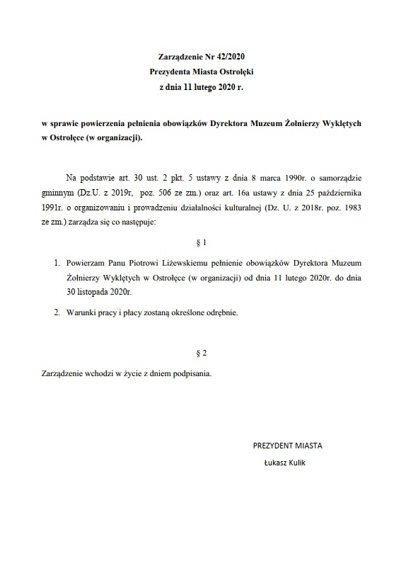 - Pod koniec 2019 roku Rada Miasta Ostrołęki podjęła uchwałę wyrażającą wolę przekazania Muzeum Żołnierzy Wyklętych w Ostrołęce właściwemu ministrowi. Od tego czasu Prezydent Miasta Ostrołęki Łukasz Kulik prowadzi intensywne rozmowy z Ministerstwem Kultury i Dziedzictwa Narodowego mające na celu realizację powierzonego przez radę zadania. Tematem rozmów z ministerstwem był także wolny wakat dyrektora Muzeum Żołnierzy Wyklętych w Ostrołęce. Wicepremier i Minister Kultury i Dziedzictwa Narodowego zaproponował na to stanowisko Piotra Liżewskiego. W ramach pogłębiania współpracy, prezydent Łukasz Kulik przychylił się do tej propozycji. Piotr Liżewski będzie pełnić obowiązki dyrektora Muzeum Żołnierzy Wyklętych w Ostrołęce do czasu przekazania muzeum ministerstwu. W tym okresie będzie odpowiedzialny m.in. za wykonanie I etapu wystawy stałej MŻW finansowanej przez ministerstwo. Według wstępnych ustaleń muzeum w Ostrołęce ma być przejęte przez ministerstwo do końca bieżącego roku - informuje Urząd Miasta Ostrołęki.