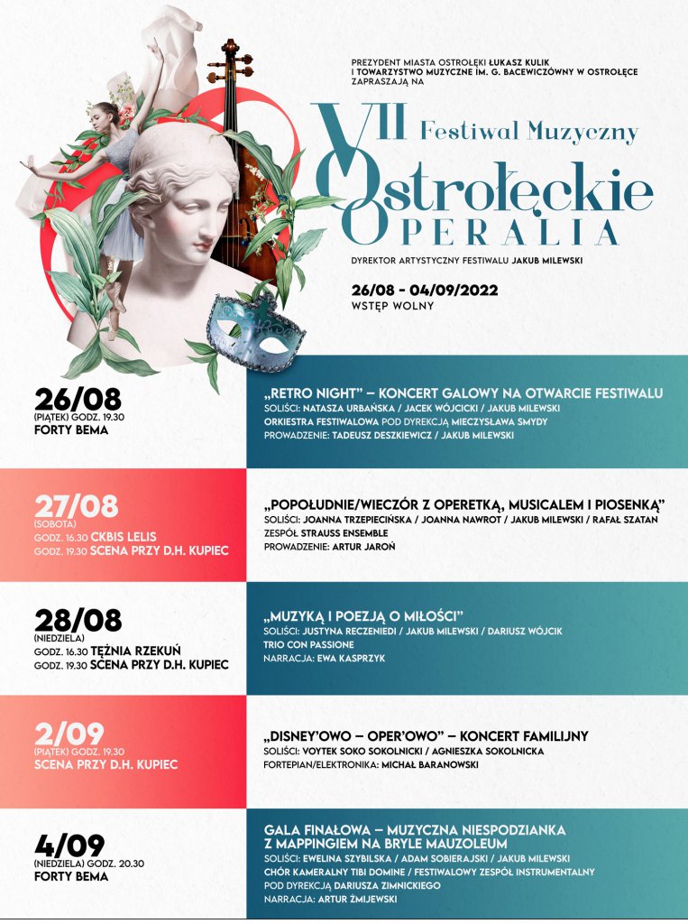 - Wraz z Prezydentem Miasta Ostrołęki - Łukaszem Kulikiem, jak też Towarzystwem Muzycznym im. Grażyny Bacewiczówny w Ostrołęce, licznymi naszymi partnerami: Ministerstwem Kultury i Dziedzictwa Narodowego / Narodowym Centrum Kultury, Miastem Ostrołęka, Samorządem Województwa Mazowieckiego, Starostwem Powiatowym w Ostrołęce, Muzeum Kultury Kurpiowskiej, Ostrołęckim Centrum Kultury, MZOSTiIT, MZK, WSAP, Gminą Lelis i Gminą Rzekuń już dziś zapraszam na siedem poniższych wydarzeń! - dodaje.