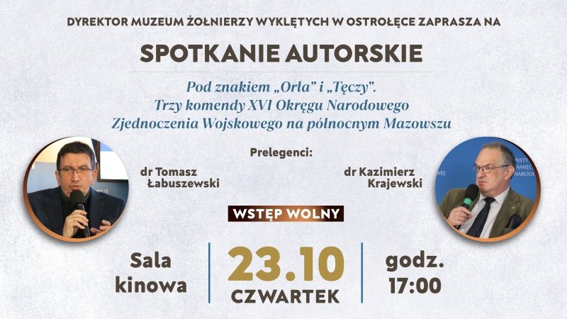 Muzeum Żołnierzy Wyklętych w Ostrołęce zaprasza na wyjątkowe spotkanie, które z pewnością zainteresuje wszystkich pasjonatów historii najnowszej Polski. Już w czwartek 23 października, Muzeum gościć będzie dr. Kazimierza Krajewskiego i dr. Tomasza Łabuszewskiego – uznawanych za najwybitniejszych badaczy powojennego podziemia niepodległościowego w Polsce.