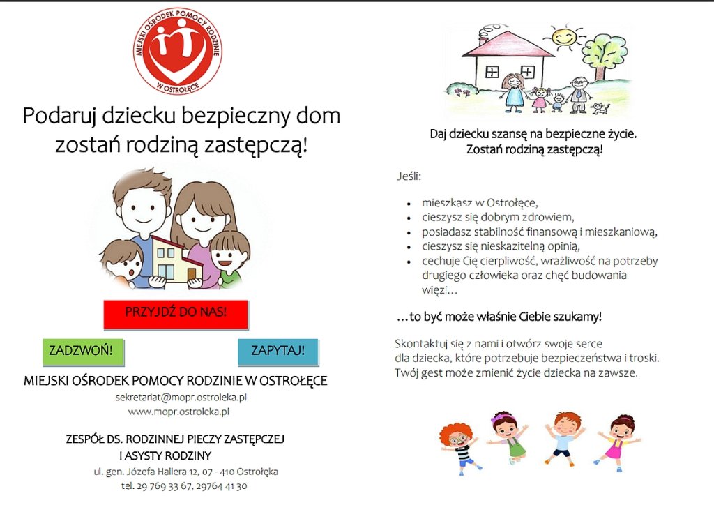 MOPR w Ostrołęce zachęca wszystkich chętnych do kontaktu i rozmowy na temat możliwości zostania rodzicem zastępczym.