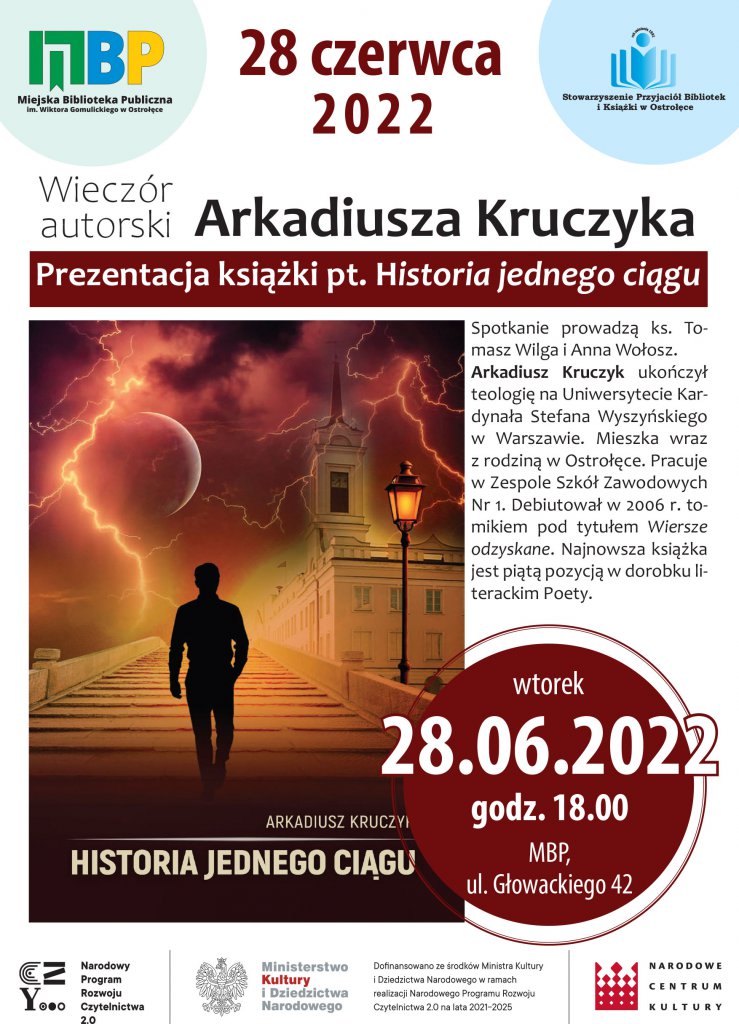 Wieczór autorski z Arkadiuszem Kruczykiem połączony z promocją książki "Historia jednego ciągu" odbędzie się 28 czerwca 2022 r. o godz. 18:00 w Miejskiej Bibliotece Publicznej w Ostrołęce. Spotkanie poprowadzą ks. Tomasz Wilga i Anna Wołosz.