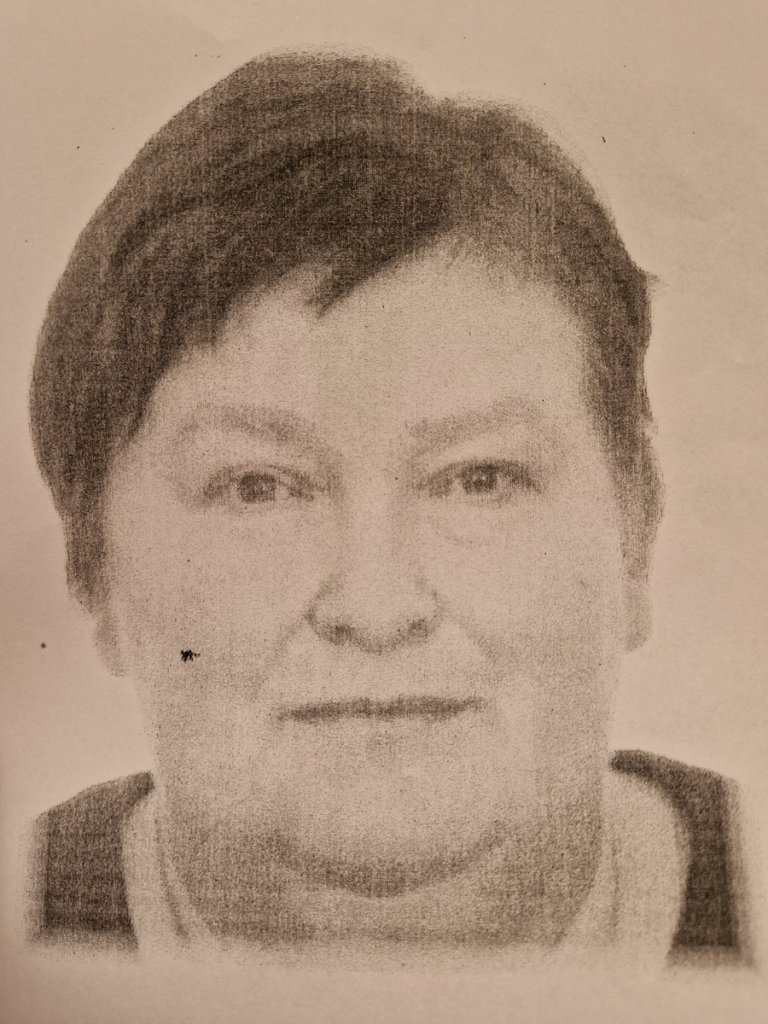 - Rysopis zaginionej:164 cm wzrostu, krępej budowy ciała, włosy krótkie siwiejące.