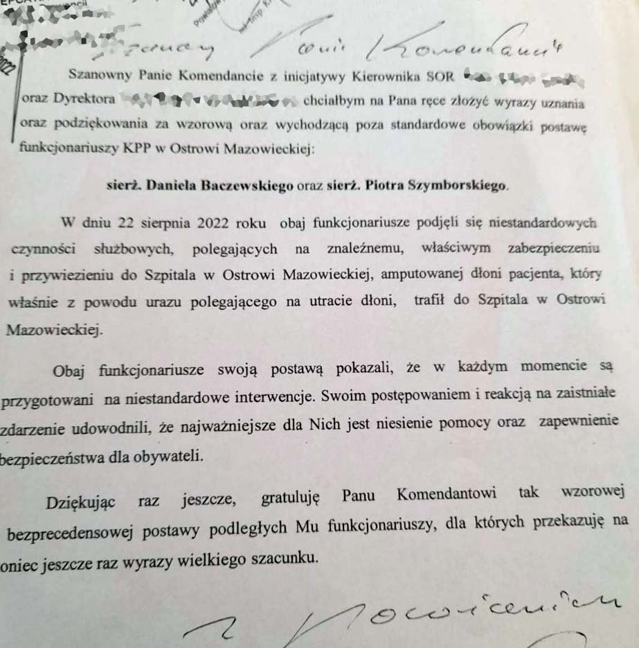 Na początku września do Komendanta Powiatowego Policji mł. insp. Krzysztofa Szymańskiego wpłynęło pismo od dyrekcji szpitala wyrażające słowa uznania i podziękowania za wyjątkową postawę godną naśladowania.