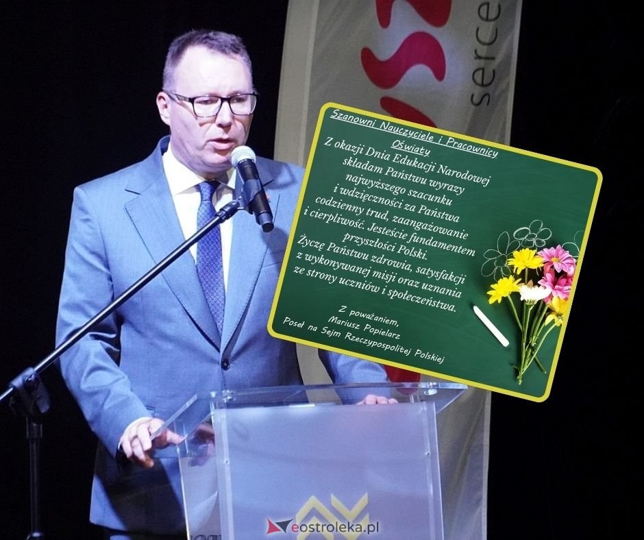 "Szanowni Nauczyciele i Pracownicy Oświaty, z okazji Dnia Edukacji Narodowej składam Państwu wyrazy najwyższego szacunku i wdzięczności za Państwa codzienny trud, zaangażowanie i cierpliwość" – napisał Mariusz Popielarz. W swoich życzeniach podkreślił kluczową rolę, jaką odgrywają oni w społeczeństwie, nazywając ich "fundamentem przyszłości Polski".